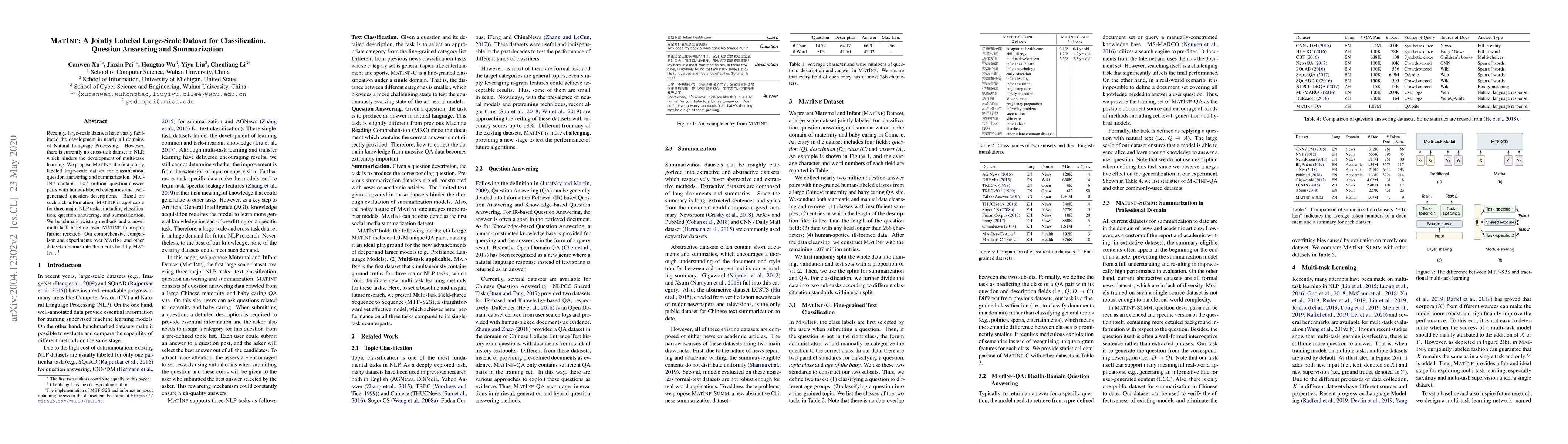 MATINF is a novel large-scale dataset jointly labeled for classification, question answering, and summarization, aiming to facilitate multi-task learning in NLP. The dataset contains 1.07 million question-answer pairs with human-labeled categories and user-generated question descriptions.