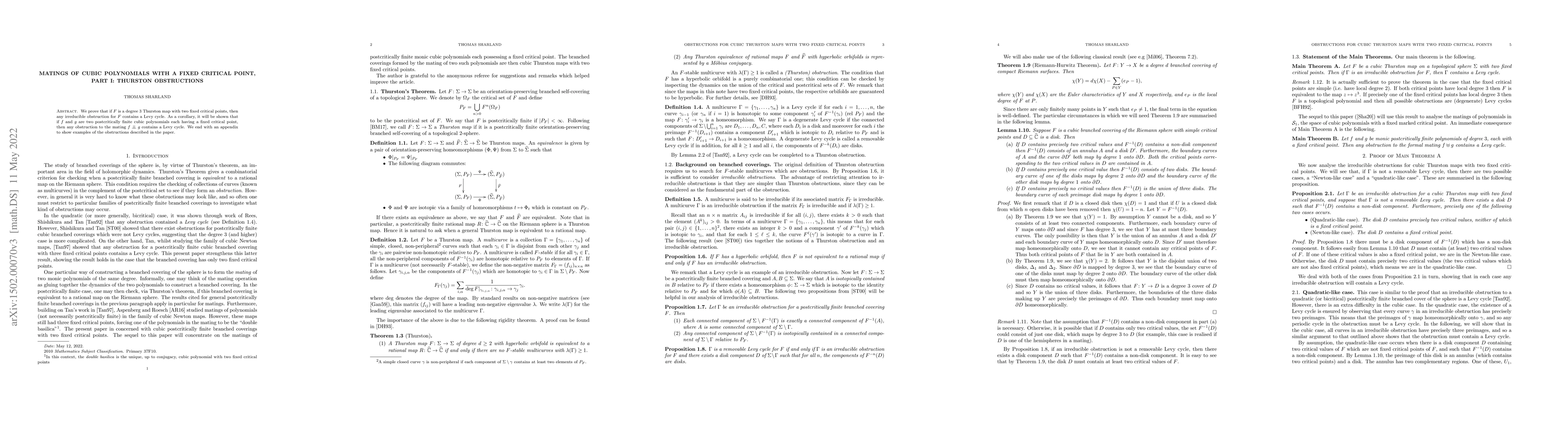 We prove that if $F$ is a degree $3$ Thurston map with two fixed critical points, then any irreducible obstruction for $F$ contains a Levy cycle. As a corollary, it will be shown that if $f$ and $g$ are two postcritically finite cubic polynomials each having a fixed critical point, then any obstruction to the mating $f \mate g$ contains a Levy cycle. We end with an appendix to show examples of the obstructions described in the paper.
