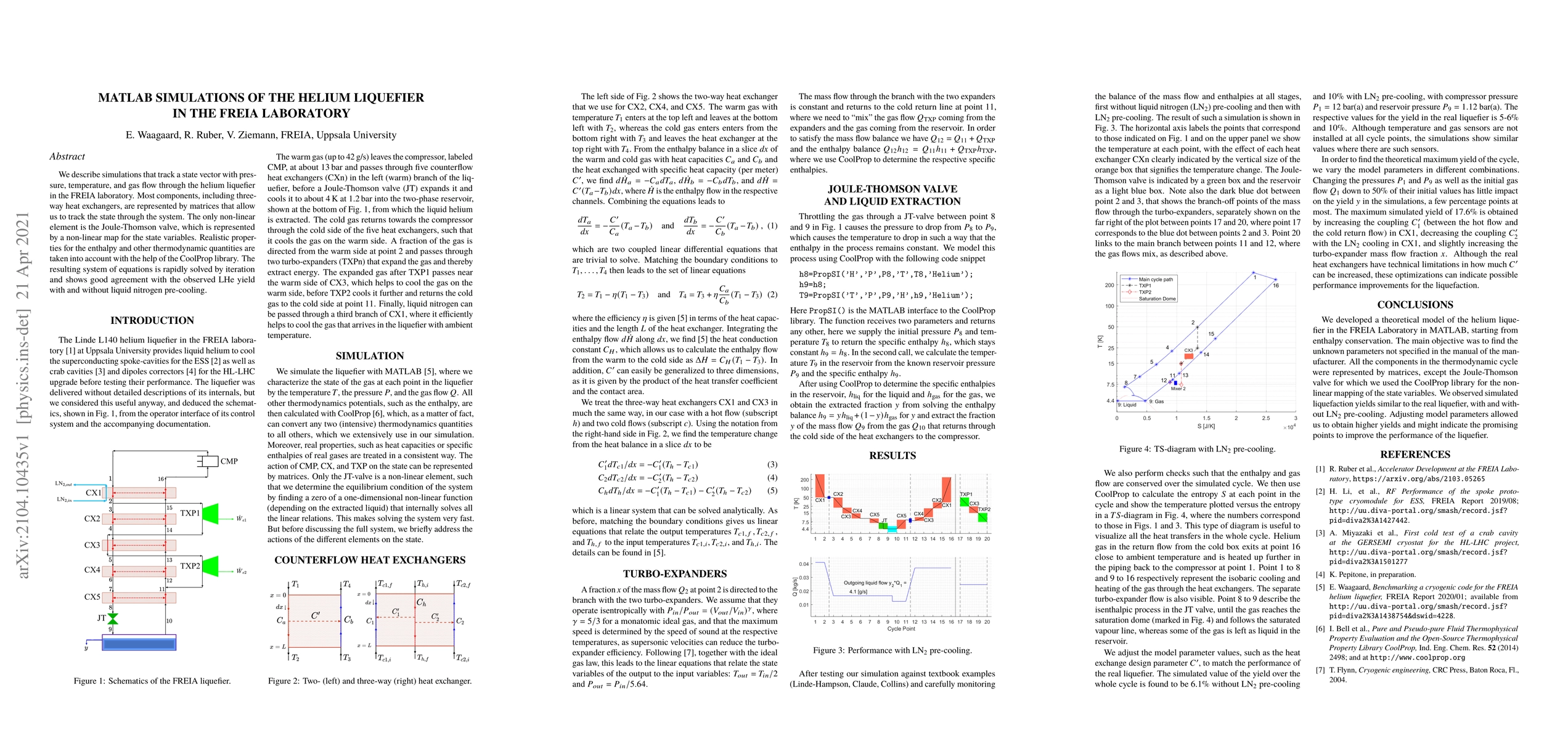 This paper details MATLAB simulations of the helium liquefier in the FREIA laboratory, tracking pressure, temperature, and gas flow through various components represented by matrices. The non-linear Joule-Thomson valve is modeled with a non-linear map, and thermodynamic properties are refined using the CoolProp library, yielding accurate results matching observed LHe yield.