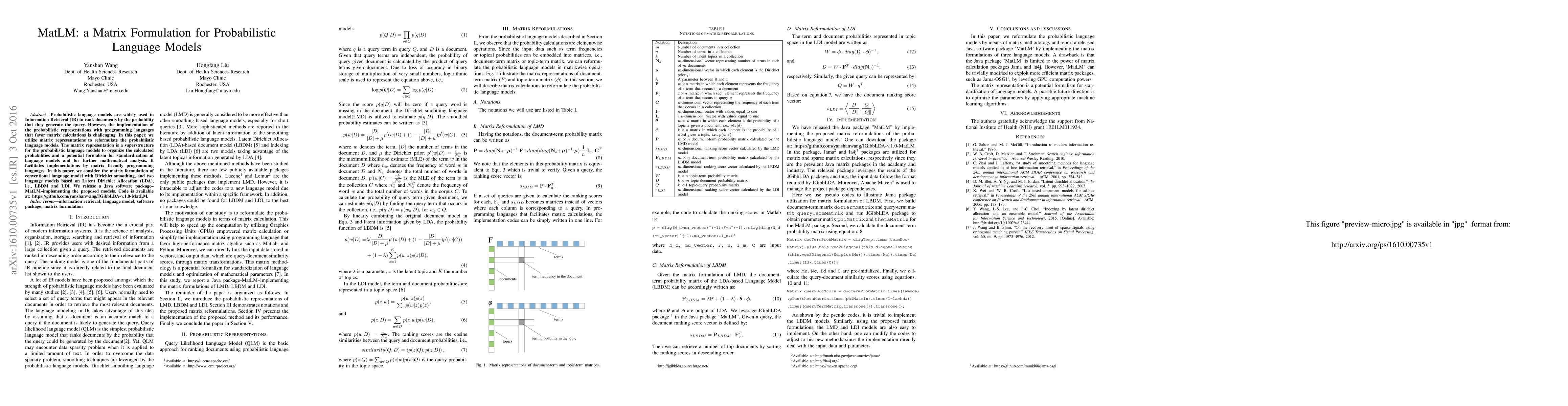 This paper proposes a matrix formulation for probabilistic language models to facilitate their implementation in matrix-friendly programming languages. It reformulates conventional and LDA-based models, releasing a Java software package, MatLM, to implement these models.