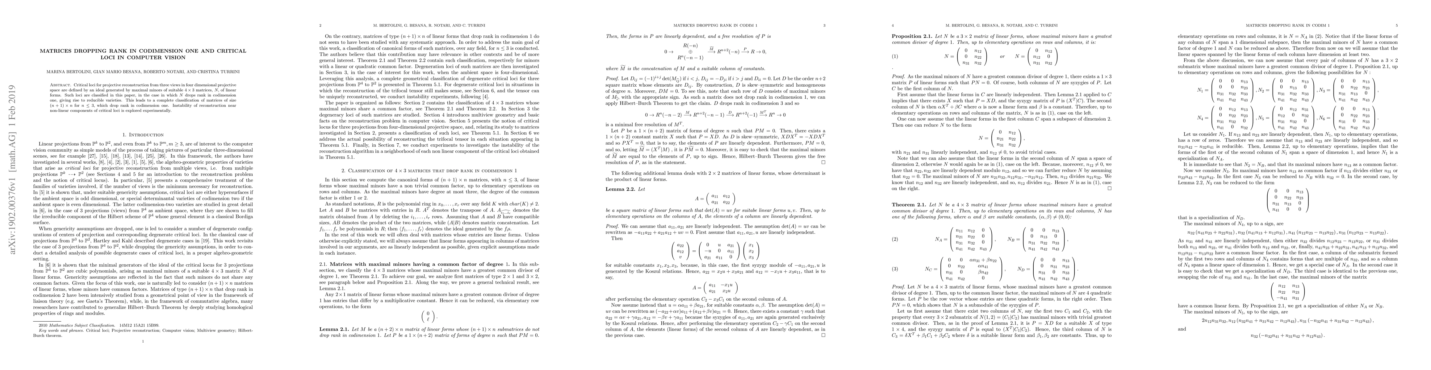 Critical loci for projective reconstruction from three views in four dimensional projective space are defined by an ideal generated by maximal minors of suitable $4 \times 3$ matrices, $N,$ of linear forms. Such loci are classified in this paper, in the case in which $N$ drops rank in codimension one, giving rise to reducible varieties. This leads to a complete classification of matrices of size $(n+1) \times n$ for $n \le 3,$ which drop rank in codimension one. Instability of reconstruction near non-linear components of critical loci is explored experimentally.
