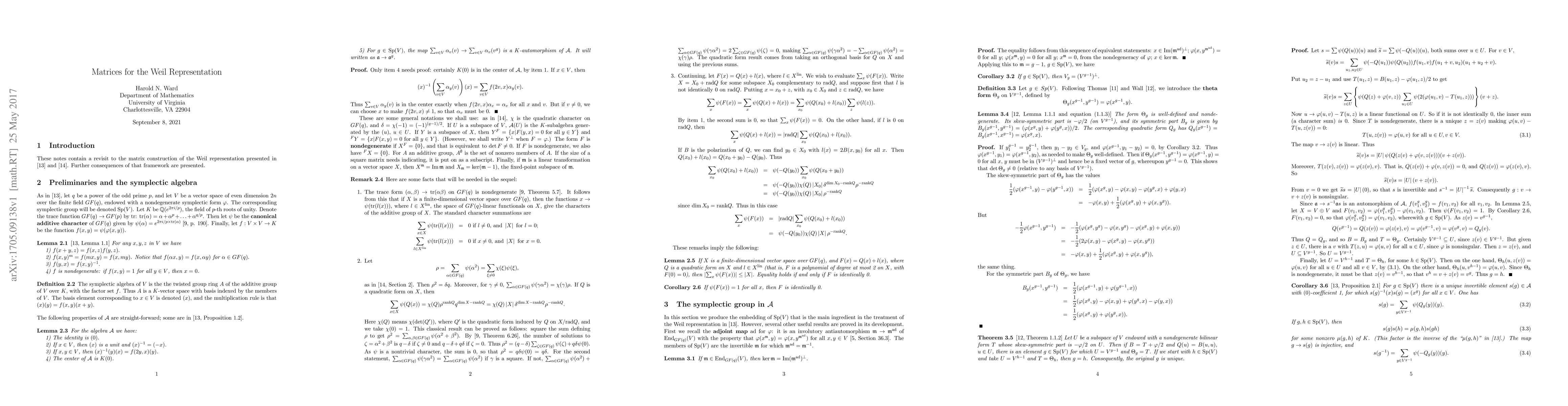 These notes contain a revisit to the matrix construction of the Weil representation by the author in the Journal of Algebra in 1972.
