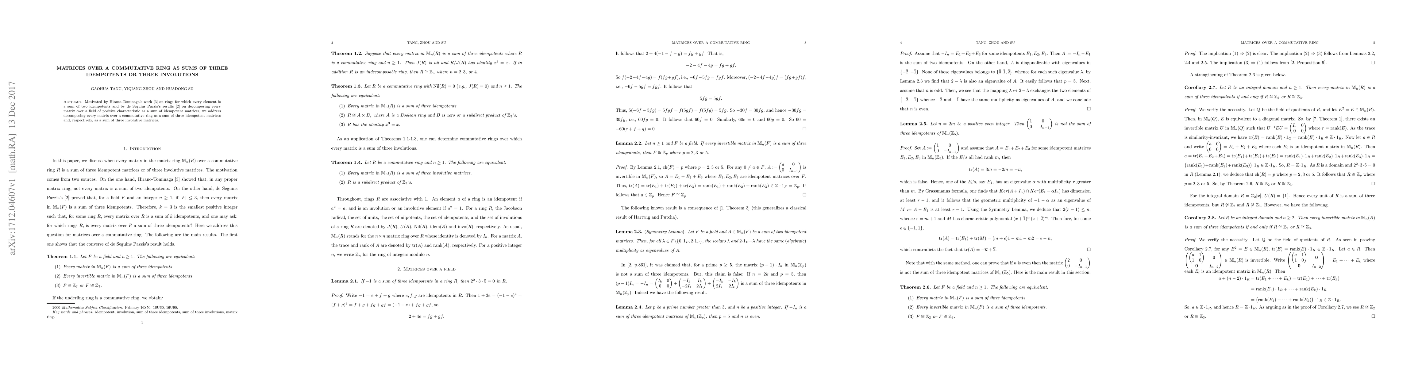 Motivated by Hirano-Tominaga's work \cite{HT} on rings for which every element is a sum of two idempotents and by de Seguins Pazzis's results \cite{de} on decomposing every matrix over a field of positive characteristic as a sum of idempotent matrices, we address decomposing every matrix over a commutative ring as a sum of three idempotent matrices and, respectively, as a sum of three involutive matrices.