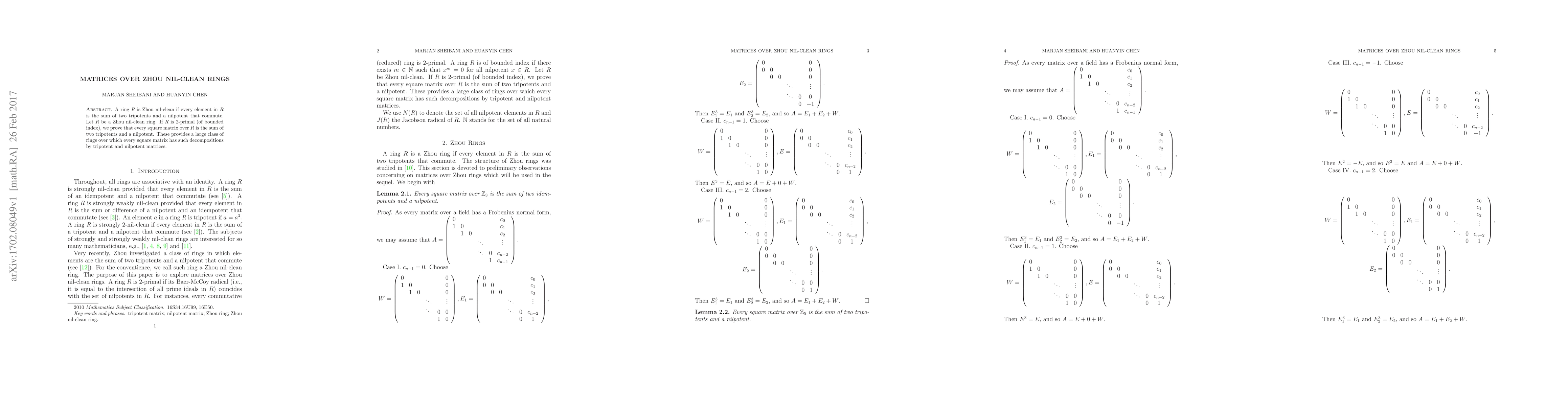 This paper proves that in a 2-primal Zhou nil-clean ring, every square matrix can be decomposed into the sum of two tripotent matrices and a nilpotent matrix, expanding the class of rings where such matrix decompositions hold.