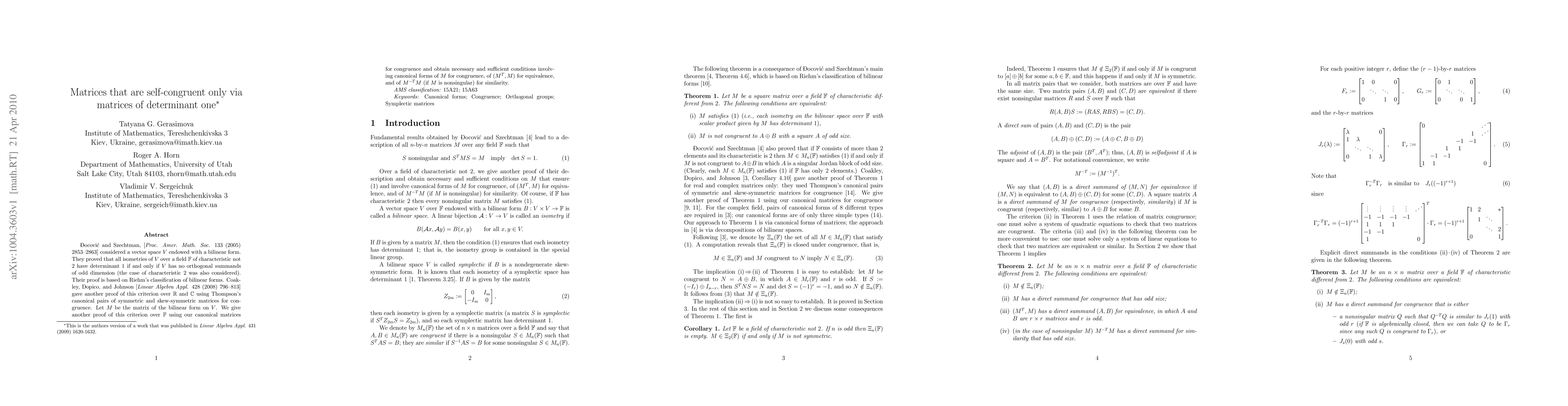 Docovic and Szechtman, [Proc. Amer. Math. Soc. 133 (2005) 2853-2863] considered a vector space V endowed with a bilinear form. They proved that all isometries of V over a field F of characteristic not 2 have determinant 1 if and only if V has no orthogonal summands of odd dimension (the case of characteristic 2 was also considered). Their proof is based on Riehm's classification of bilinear forms. Coakley, Dopico, and Johnson [Linear Algebra Appl. 428 (2008) 796-813] gave another proof of this criterion over the fields of real and complex numbers using Thompson's canonical pairs of symmetric and skew-symmetric matrices for congruence. Let M be the matrix of the bilinear form on V. We give another proof of this criterion over F using our canonical matrices for congruence and obtain necessary and sufficient conditions involving canonical forms of M for congruence, of (M^T,M) for equivalence, and of M^{-T}M (if M is nonsingular) for similarity.