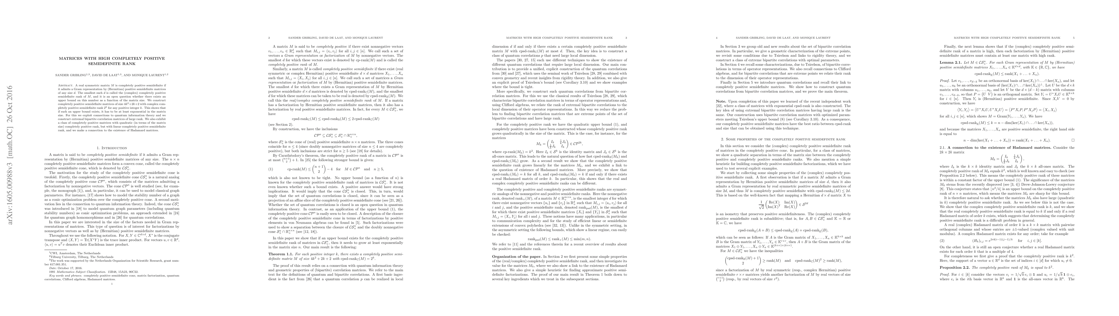 This paper constructs large completely positive semidefinite matrices with exponentially increasing rank in terms of matrix size, suggesting an upper bound on the rank must be exponential. It also explores a class of matrices with quadratic positive rank but linear semidefinite rank, linking these findings to quantum information theory and Hadamard matrices.