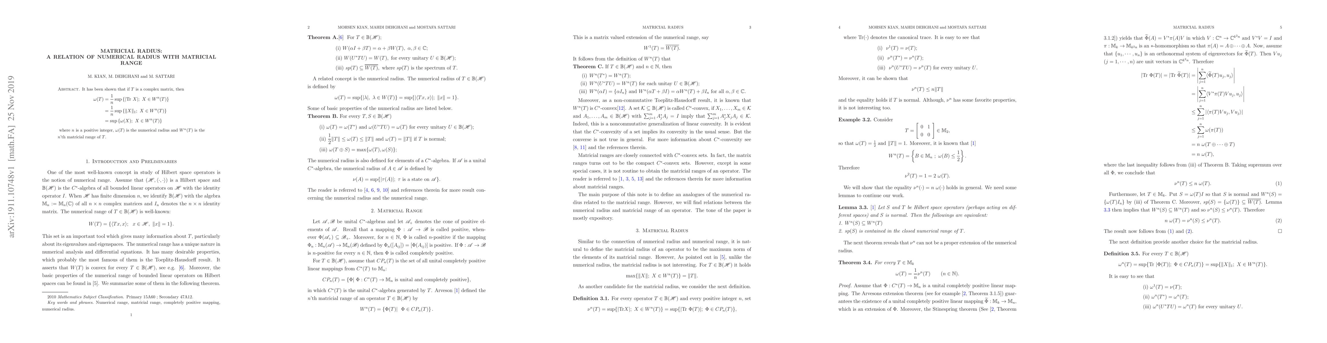 This research paper establishes a relationship between the numerical radius of a complex matrix T and its matricial range, denoted as W^n(T). It presents an equality showing that the matricial radius, which considers the trace or 1-norm of matrices in W^n(T), equals the supremum of the numerical radii of those matrices. This finding contributes to the understanding of matrix analysis and operator theory.