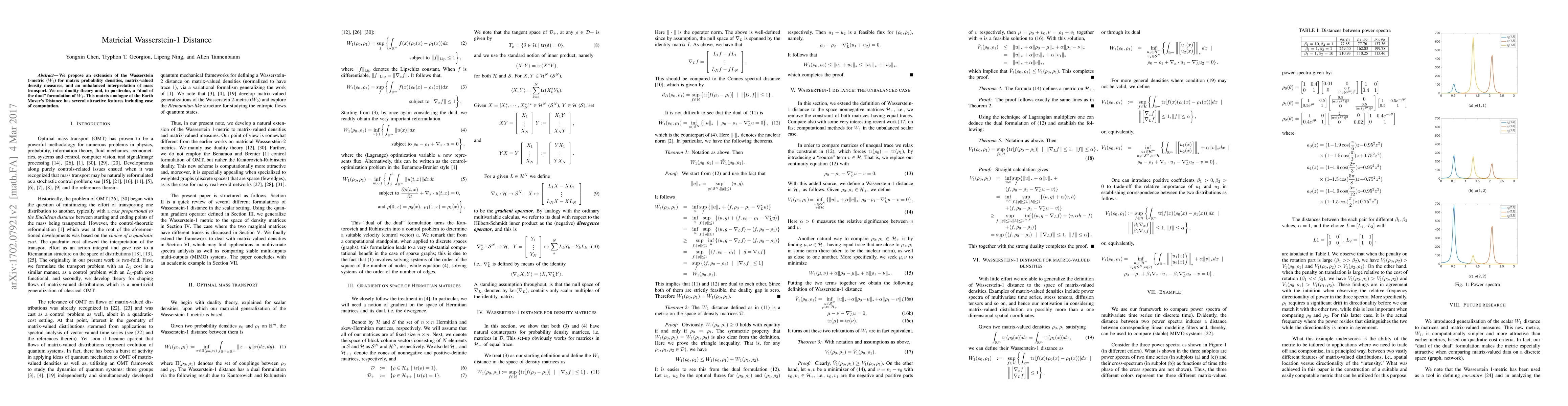 This paper introduces a matrix extension of the Wasserstein 1-metric, leveraging duality theory for matrix probability densities and an unbalanced mass transport interpretation. The proposed "dual of the dual" formulation offers an efficient computation method akin to the Earth Mover's Distance.