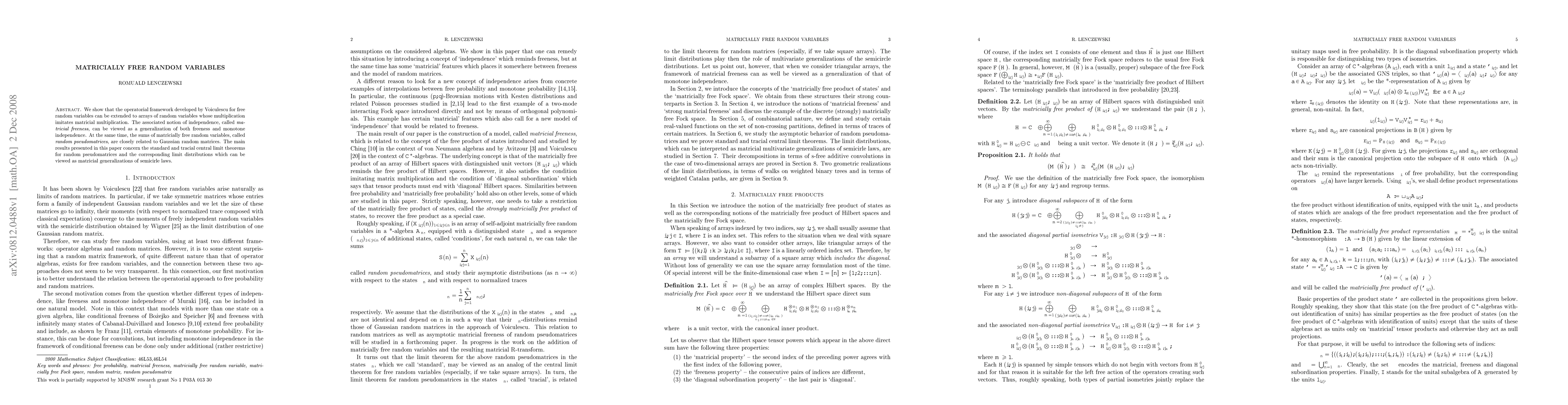 This paper extends Voiculescu's operatorial framework for free random variables to arrays of random variables that follow matricial multiplication, introducing a new notion of independence termed matricial freeness. The study focuses on the central limit theorems for random pseudomatrices, revealing their connection to Gaussian random matrices and matricial generalizations of semicircle laws.