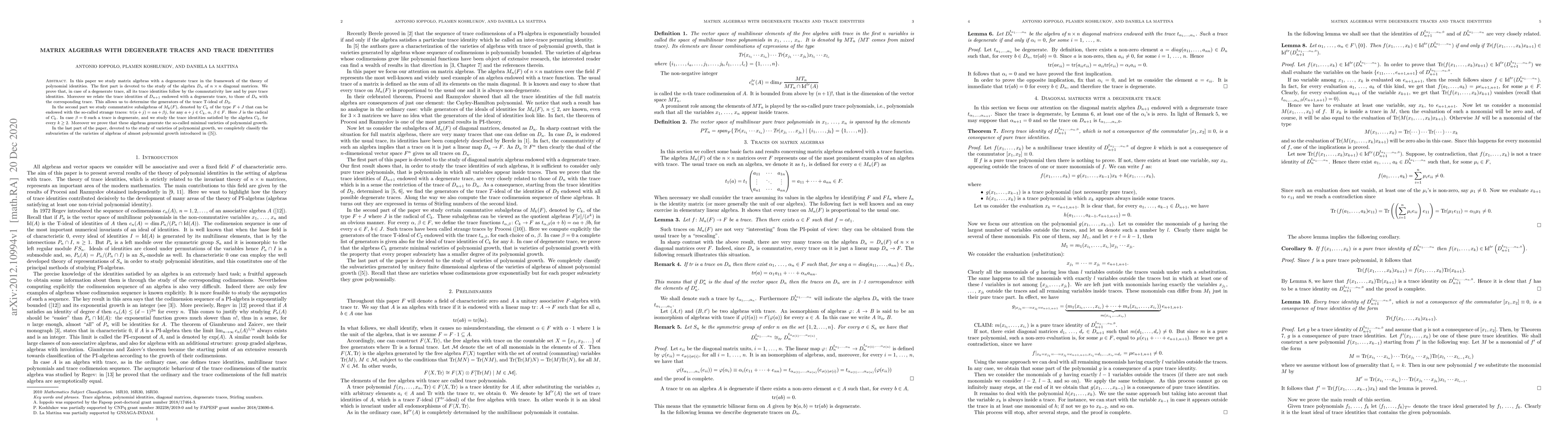 This paper investigates matrix algebras with degenerate traces within the theory of polynomial identities. It first explores the algebra of diagonal matrices $D_n$ and shows that its trace identities are governed by commutativity and pure trace identities. The second part examines commutative subalgebras $C_k$ of matrix algebras endowed with strange traces, proving they generate minimal varieties of polynomial growth. Lastly, it classifies subvarieties of algebras of almost polynomial growth.