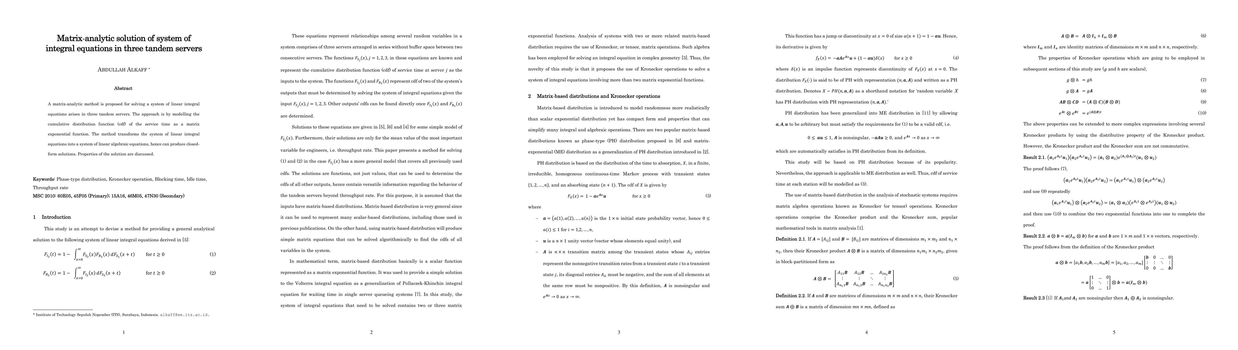 A matrix-analytic method is proposed for solving a system of linear integral equations arises in three tandem servers. The approach is by modelling the cumulative distribution function (cdf) of the service time as a matrix exponential function. The method transforms the system of linear integral equations into a system of linear algebraic equations, hence can produce closed-form solutions. Properties of the solution are discussed.