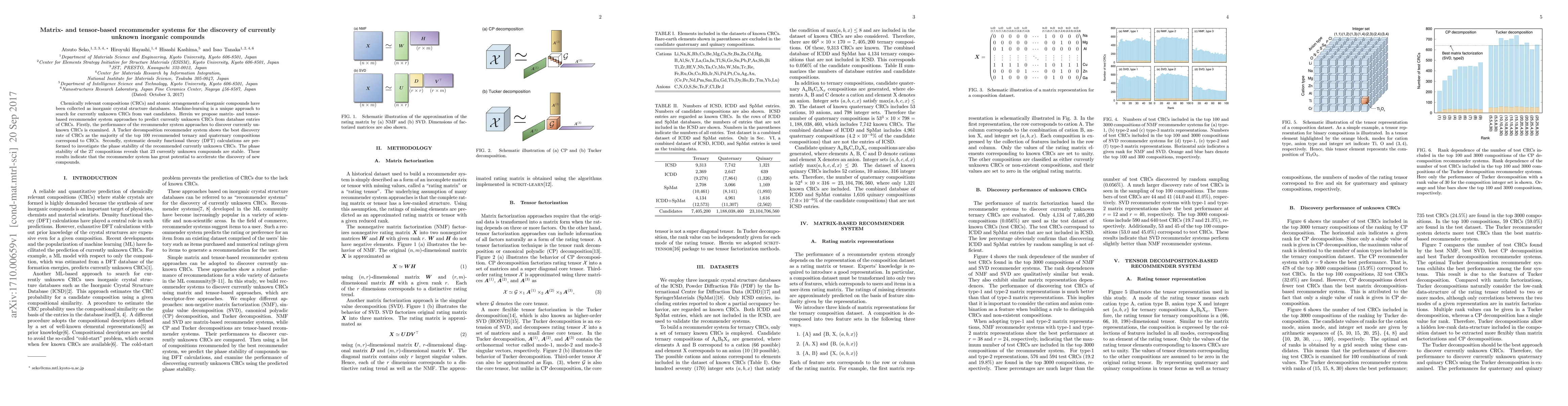 This paper proposes matrix- and tensor-based recommender systems to predict unknown inorganic compounds from existing crystal structure databases. The Tucker decomposition method shows the highest discovery rate, with 23 out of 27 recommended stable compounds, indicating the system's potential to accelerate new compound discovery.