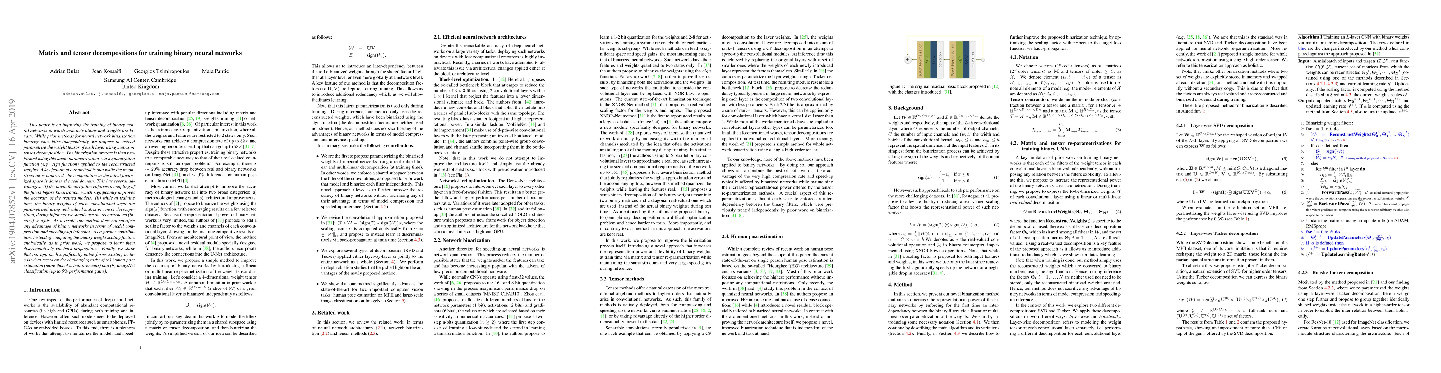 This paper proposes a novel method for training binary neural networks using matrix or tensor decomposition to parametrize weight tensors, which improves model accuracy and maintains the benefits of binary networks. The method outperforms existing techniques in human pose estimation and ImageNet classification.