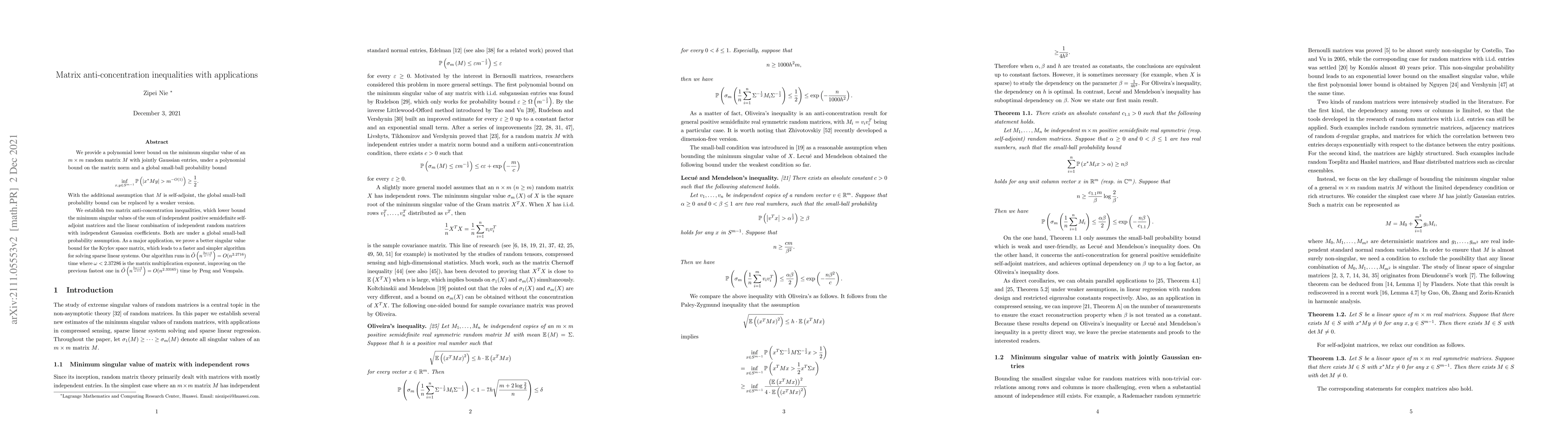 This paper establishes polynomial lower bounds on the minimum singular value of random matrices with Gaussian entries under certain probabilistic conditions. It introduces two matrix anti-concentration inequalities, which improve the singular value bound for Krylov space matrices and lead to a faster algorithm for solving sparse linear systems, running in $O(n^{2.2716})$ time.