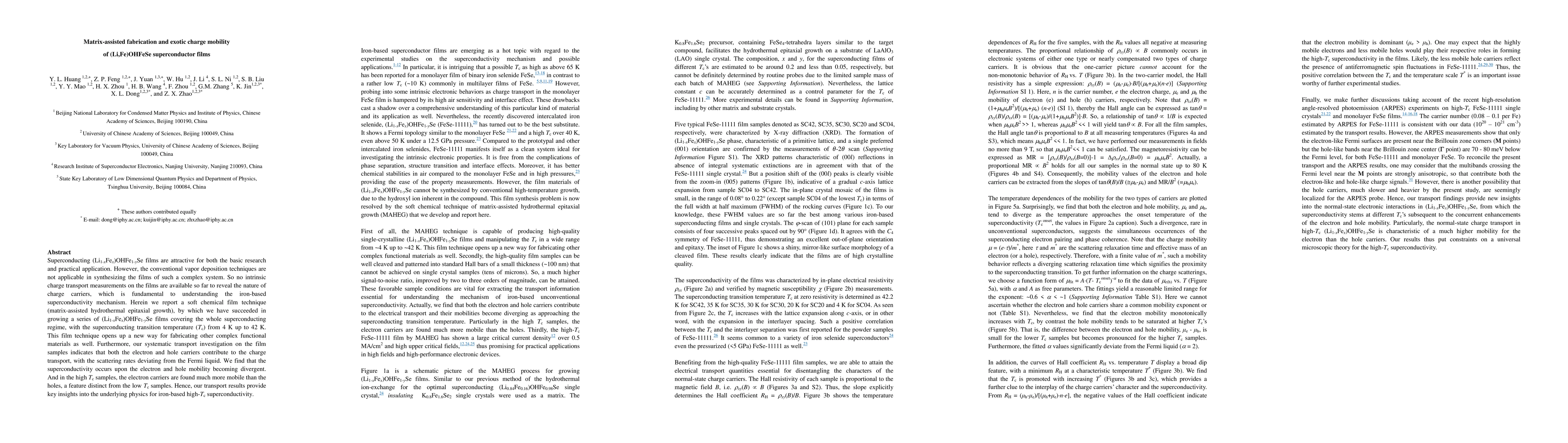 This paper reports a matrix-assisted hydrothermal epitaxial growth technique for fabricating superconducting (Li1-xFex)OHFe1-ySe films, achieving Tc up to 42 K. The study reveals that both electron and hole carriers contribute to charge transport, with unique charge mobility characteristics that differ between high and low Tc samples, providing insights into iron-based superconductivity.