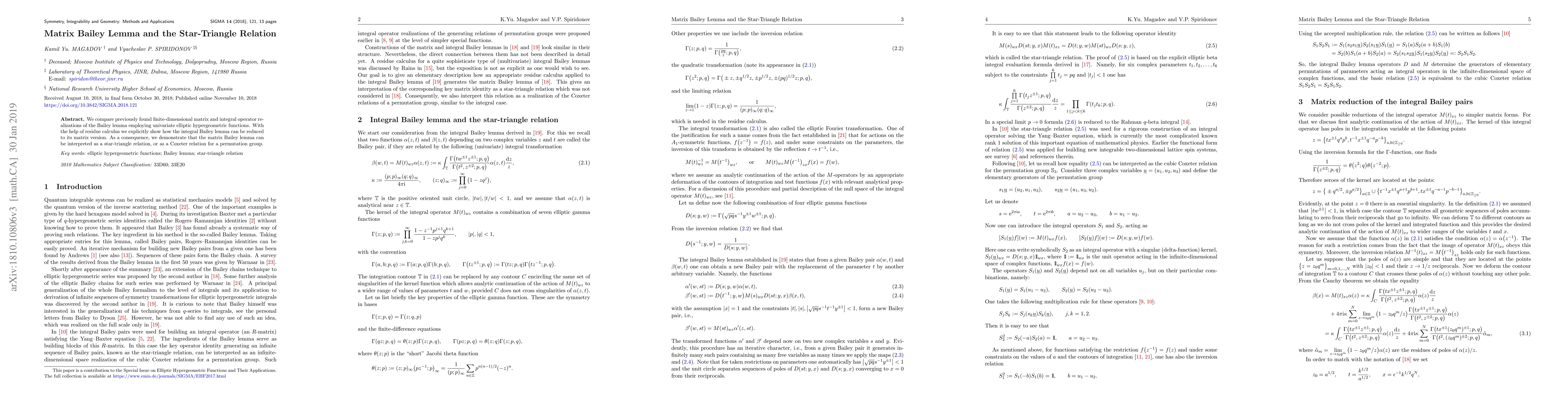 This paper compares matrix and integral operator realizations of the Bailey lemma using elliptic hypergeometric functions, showing how the integral version reduces to the matrix version via residue calculus. It concludes that the matrix Bailey lemma corresponds to a star-triangle relation or Coxeter relation for a permutation group.