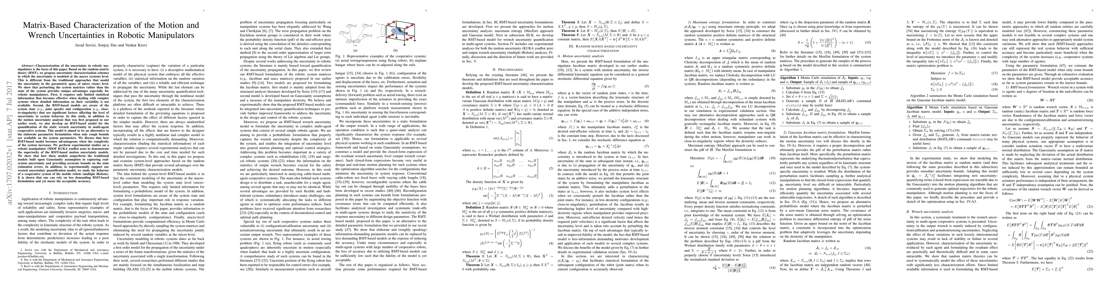 Characterization of the uncertainty in robotic manipulators is the focus of this paper. Based on the random matrix theory (RMT), we propose uncertainty characterization schemes in which the uncertainty is modeled at the macro (system) level. This is different from the traditional approaches that model the uncertainty in the parametric space of micro (state) level. We show that perturbing the system matrices rather than the state of the system provides unique advantages especially for robotic manipulators. First, it requires only limited statistical information that becomes effective when dealing with complex systems where detailed information on their variability is not available. Second, the RMT-based models are aware of the system state and configuration that are significant factors affecting the level of uncertainty in system behavior. In this study, in addition to the motion uncertainty analysis that was first proposed in our earlier work, we also develop an RMT-based model for the quantification of the static wrench uncertainty in multi-agent cooperative systems. This model is aimed to be an alternative to the elaborate parametric formulation when only rough bounds are available on the system parameters. We discuss that how RMT-based model becomes advantageous when the complexity of the system increases. We perform experimental studies on a KUKA youBot arm to demonstrate the superiority of the RMT-based motion uncertainty models. We show that how these models outperform the traditional models built upon Gaussianity assumption in capturing real-system uncertainty and providing accurate bounds on the state estimation errors. In addition, to experimentally support our wrench uncertainty quantification model, we study the behavior of a cooperative system of mobile robots. It is shown that one can rely on less demanding RMT-based formulation and yet meets the acceptable accuracy.