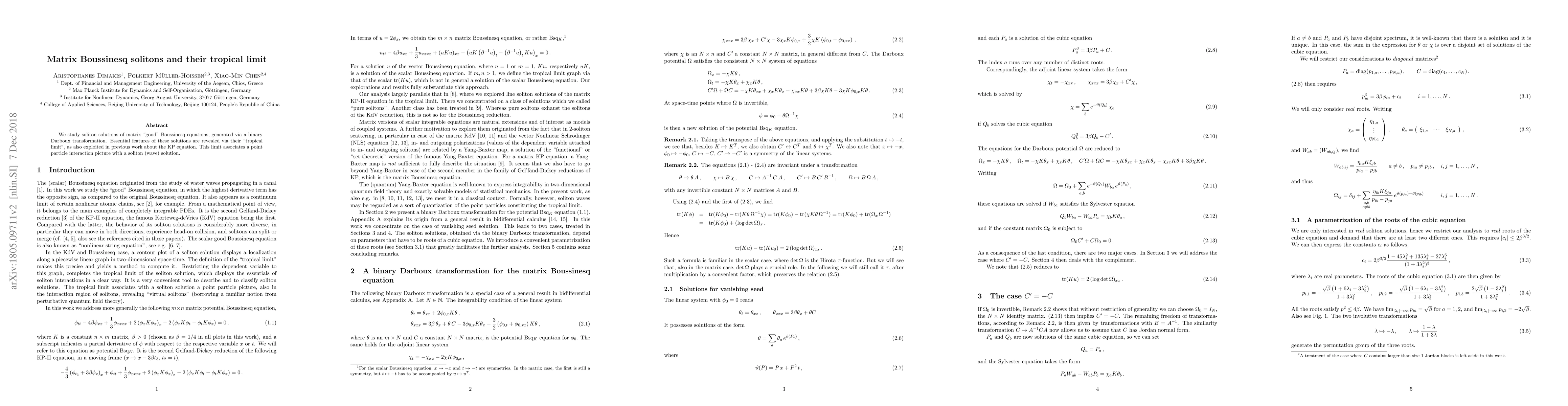 We study soliton solutions of matrix "good" Boussinesq equations, generated via a binary Darboux transformation. Essential features of these solutions are revealed via their "tropical limit", as exploited in previous work about the KP equation. This limit associates a point particle interaction picture with a soliton (wave) solution.