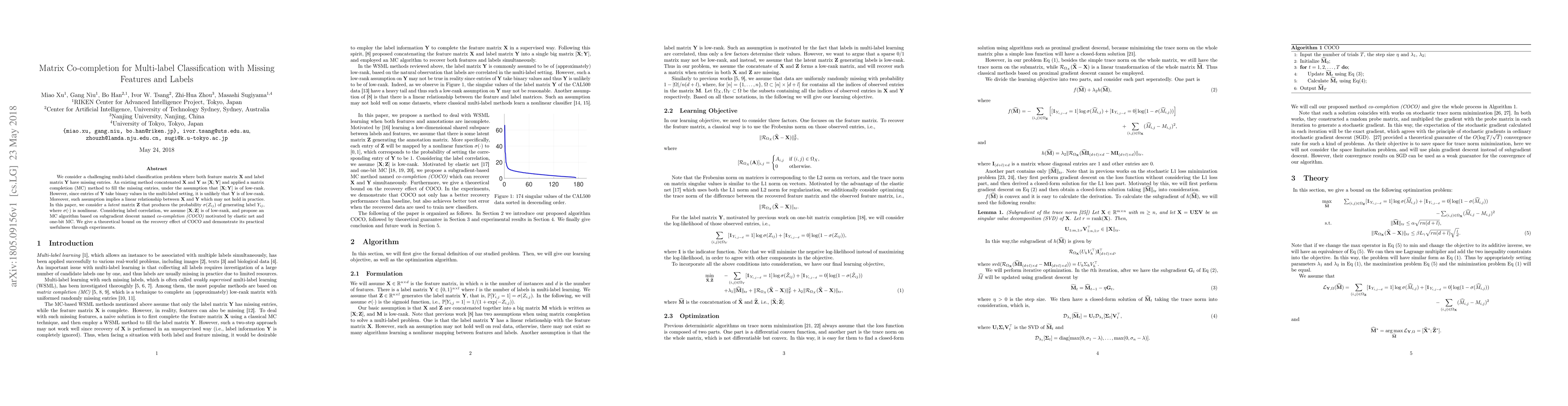 This paper proposes a novel matrix co-completion method named COCO for multi-label classification with missing features and labels, assuming a latent matrix $\Z$ to model label probabilities. It addresses the limitations of existing methods by assuming $[\X; \Z]$ is low-rank, providing a theoretical bound and demonstrating its effectiveness experimentally.