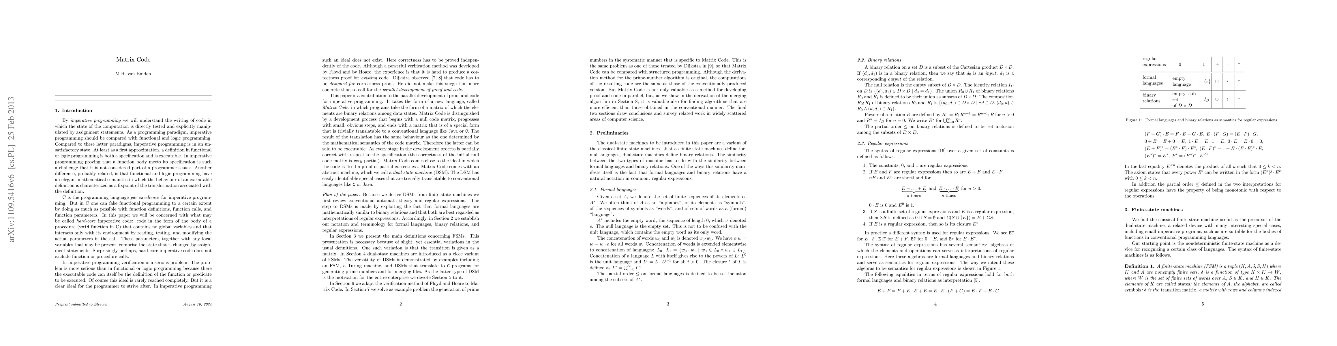 Matrix Code gives imperative programming a mathematical semantics and heuristic power comparable in quality to functional and logic programming. A program in Matrix Code is developed incrementally from a specification in pre/post-condition form. The computations of a code matrix are characterized by powers of the matrix when it is interpreted as a transformation in a space of vectors of logical conditions. Correctness of a code matrix is expressed in terms of a fixpoint of the transformation. The abstract machine for Matrix Code is the dual-state machine, which we present as a variant of the classical finite-state machine.