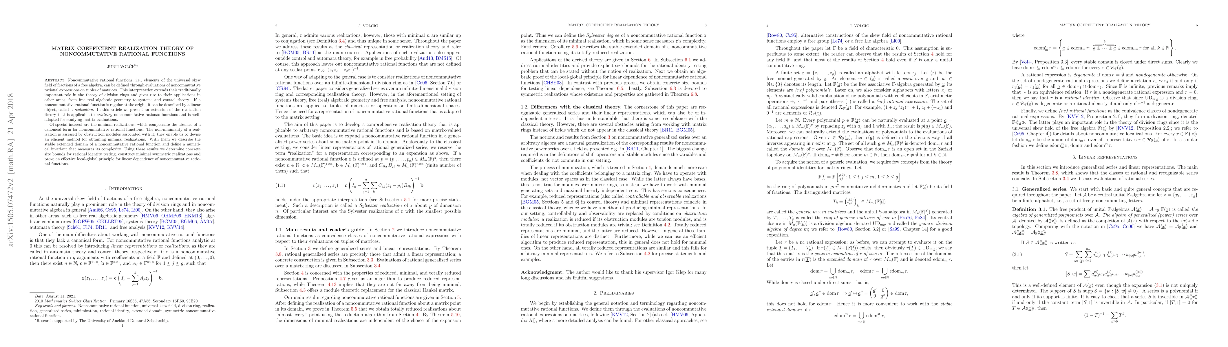 This paper develops a matrix coefficient realization theory for noncommutative rational functions, providing a framework for studying their matrix evaluations and minimal realizations. The theory enables the determination of complexity measures and size bounds for rational identity testing, and proves a local-global principle of linear dependence.