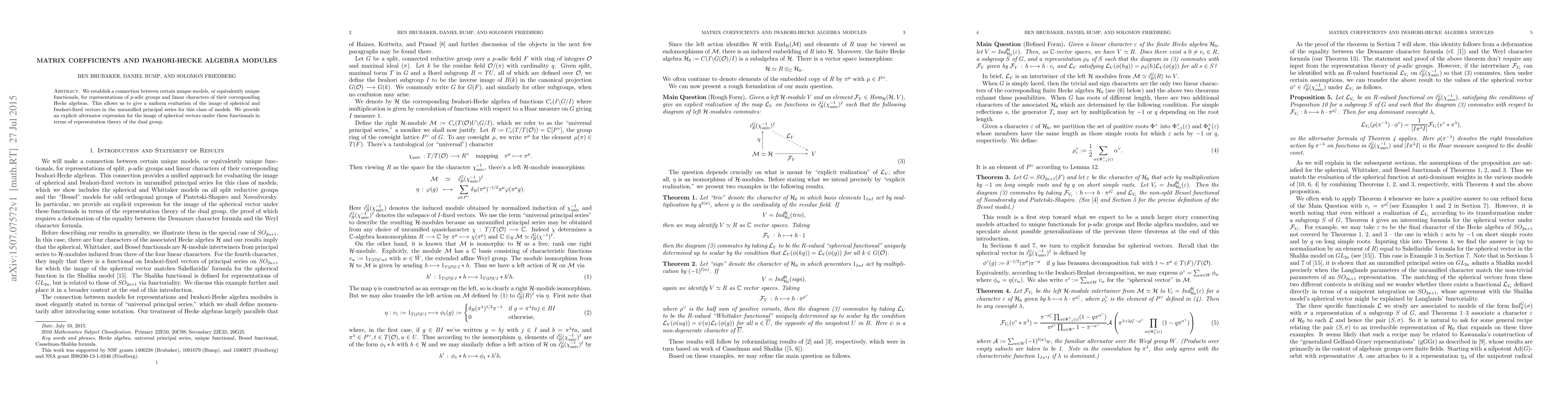 We establish a connection between certain unique models, or equivalently unique functionals, for representations of p-adic groups and linear characters of their corresponding Hecke algebras. This allows us to give a uniform evaluation of the image of spherical and Iwahori-fixed vectors in the unramified principal series for this class of models. We provide an explicit alternator expressionfor the image of the spherical vectors under these functionals in terms of the representation theory of the dual group.