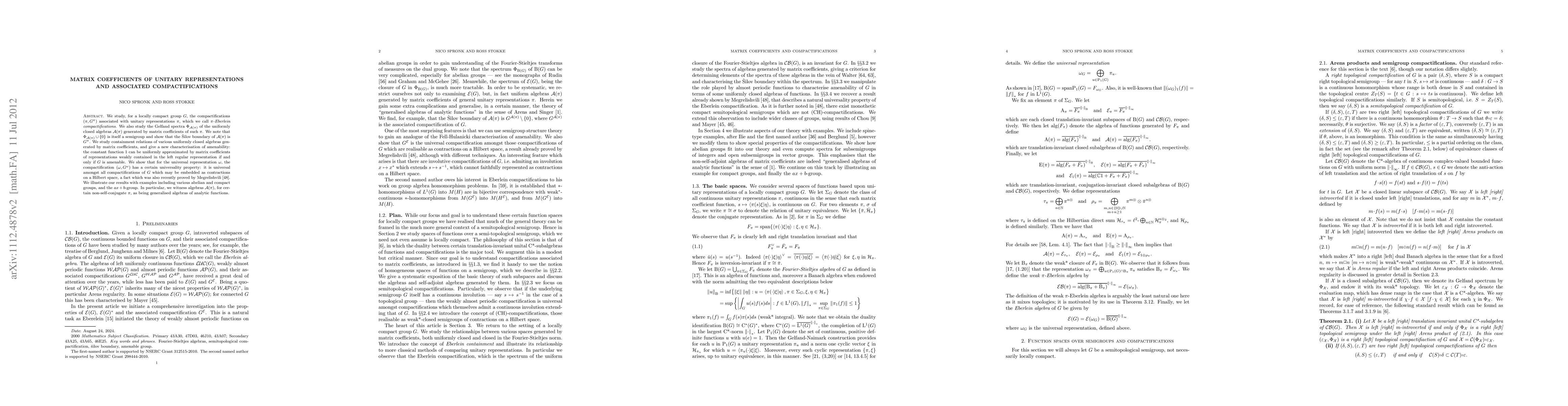 We study, for a locally compact group $G$, the compactifications $(\pi,G^\pi)$ associated with unitary representations $\pi$, which we call {\it $\pi$-Eberlein compactifications}. We also study the Gelfand spectra $\Phi_{\mathcal{A}}(\pi)}$ of the uniformly closed algebras $\mathcal{A}(\pi)$ generated by matrix coefficients of such $\pi$. We note that $\Phi_{\mathcal{A}(\pi)}\cup\{0\}$ is itself a semigroup and show that the \v{S}ilov boundary of $\mathcal{A}(\pi)$ is $G^\pi$. We study containment relations of various uniformly closed algebras generated by matrix coefficients, and give a new characterisation of amenability: the constant function 1 can be uniformly approximated by matrix coefficients of representations weakly contained in the left regular representation if and only if $G$ is amenable. We show that for the universal representation $\omega$, the compactification $(\omega,G^\omega)$ has a certain universality property: it is universal amongst all compactifications of $G$ which may be embedded as contractions on a Hilbert space, a fact which was also recently proved by Megrelishvili. We illustrate our results with examples including various abelian and compact groups, and the $ax+b$-group. In particular, we witness algebras $\fA(\pi)$, for certain non-self-conjugate $\pi$, as being generalised algebras of analytic functions.