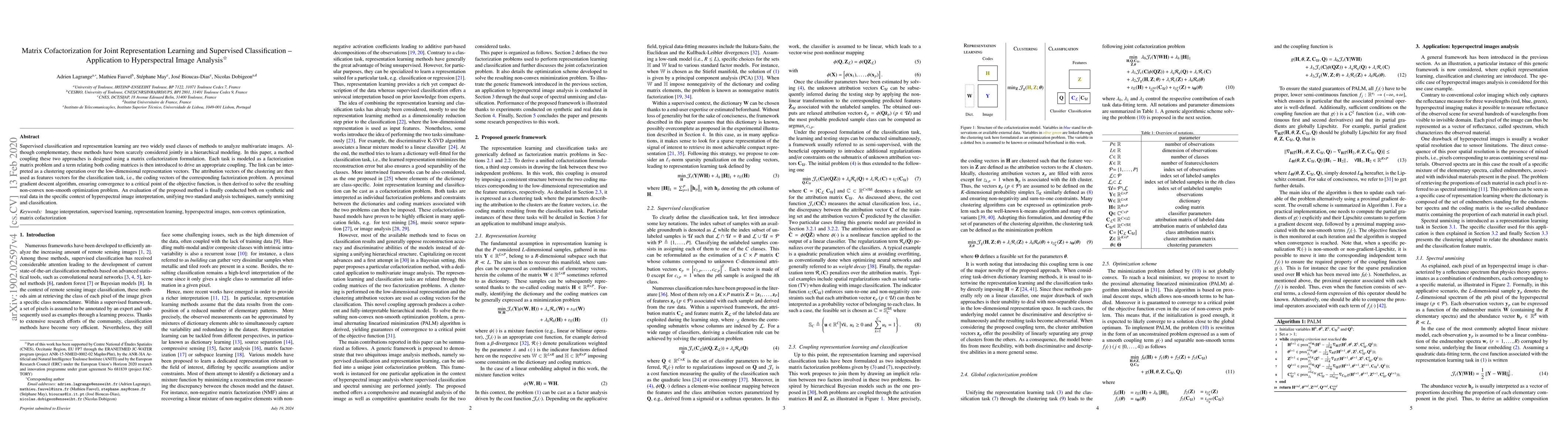 Supervised classification and representation learning are two widely used classes of methods to analyze multivariate images. Although complementary, these methods have been scarcely considered jointly in a hierarchical modeling. In this paper, a method coupling these two approaches is designed using a matrix cofactorization formulation. Each task is modeled as a factorization matrix problem and a term relating both coding matrices is then introduced to drive an appropriate coupling. The link can be interpreted as a clustering operation over a low-dimensional representation vectors. The attribution vectors of the clustering are then used as features vectors for the classification task, i.e., the coding vectors of the corresponding factorization problem. A proximal gradient descent algorithm, ensuring convergence to a critical point of the objective function, is then derived to solve the resulting non-convex non-smooth optimization problem. An evaluation of the proposed method is finally conducted both on synthetic and real data in the specific context of hyperspectral image interpretation, unifying two standard analysis techniques, namely unmixing and classification.