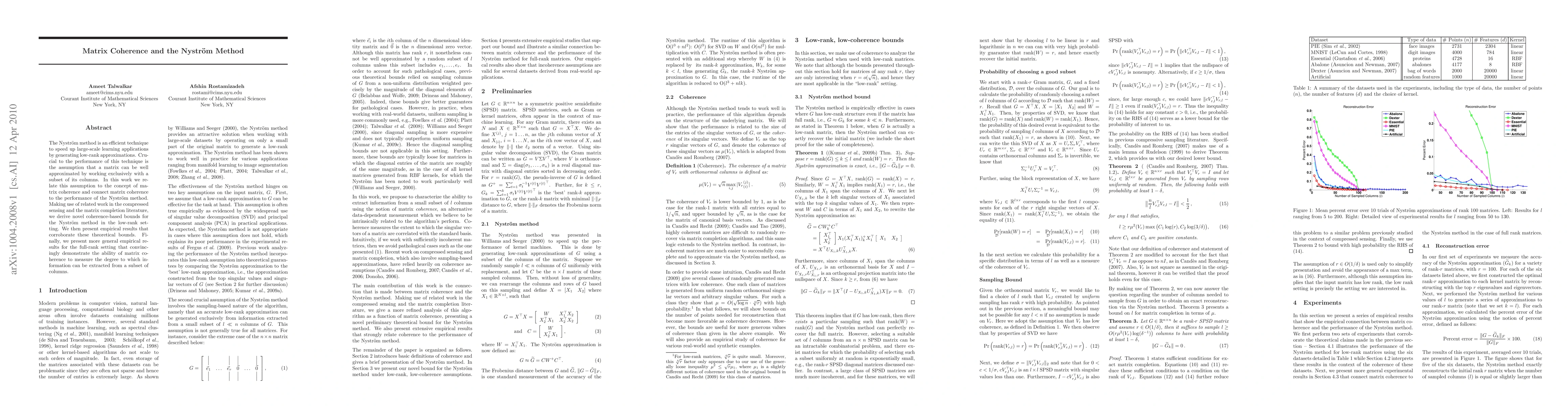 This paper relates matrix coherence to the Nystrom method, deriving novel bounds for its performance in low-rank settings, and demonstrating its effectiveness in extracting information from a subset of columns.