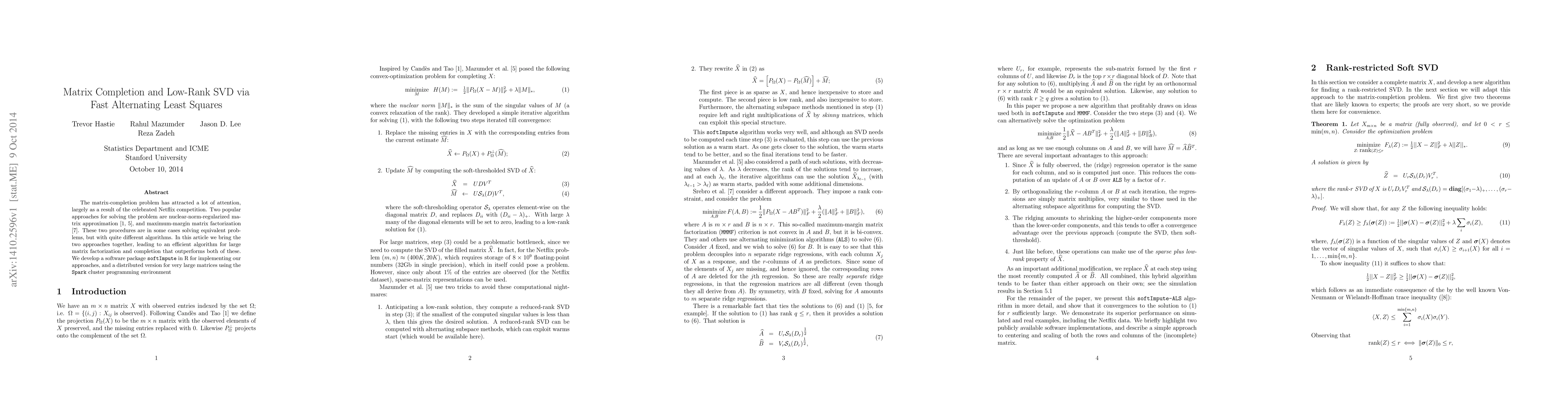 The matrix-completion problem has attracted a lot of attention, largely as a result of the celebrated Netflix competition. Two popular approaches for solving the problem are nuclear-norm-regularized matrix approximation (Candes and Tao, 2009, Mazumder, Hastie and Tibshirani, 2010), and maximum-margin matrix factorization (Srebro, Rennie and Jaakkola, 2005). These two procedures are in some cases solving equivalent problems, but with quite different algorithms. In this article we bring the two approaches together, leading to an efficient algorithm for large matrix factorization and completion that outperforms both of these. We develop a software package "softImpute" in R for implementing our approaches, and a distributed version for very large matrices using the "Spark" cluster programming environment.