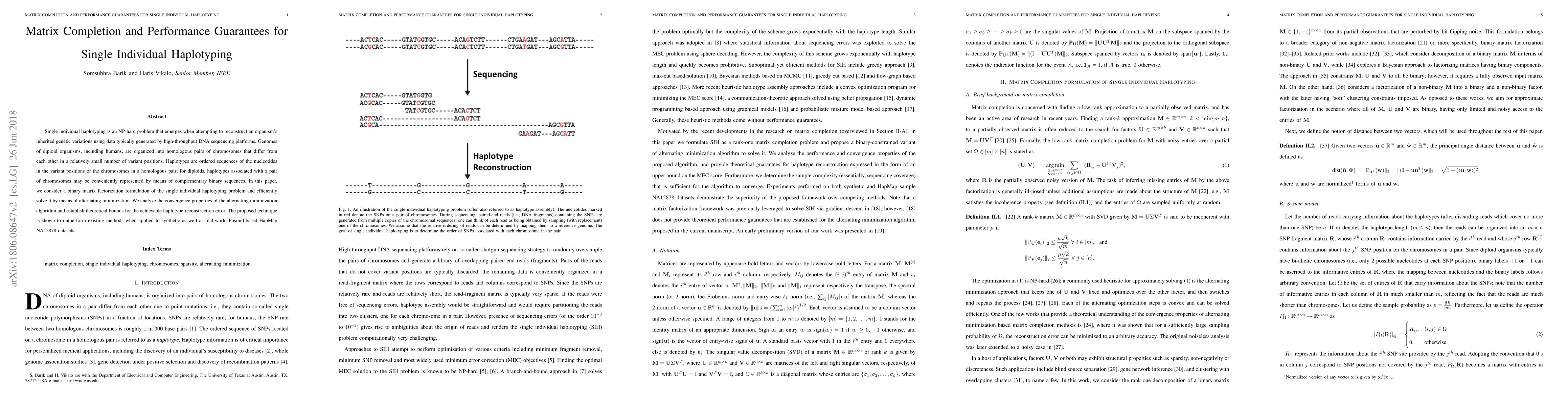 This paper proposes a binary matrix factorization approach to solve the NP-hard problem of single individual haplotyping, using an alternating minimization algorithm. It establishes theoretical bounds for reconstruction error and demonstrates superior performance over existing methods on both synthetic and real-world datasets.