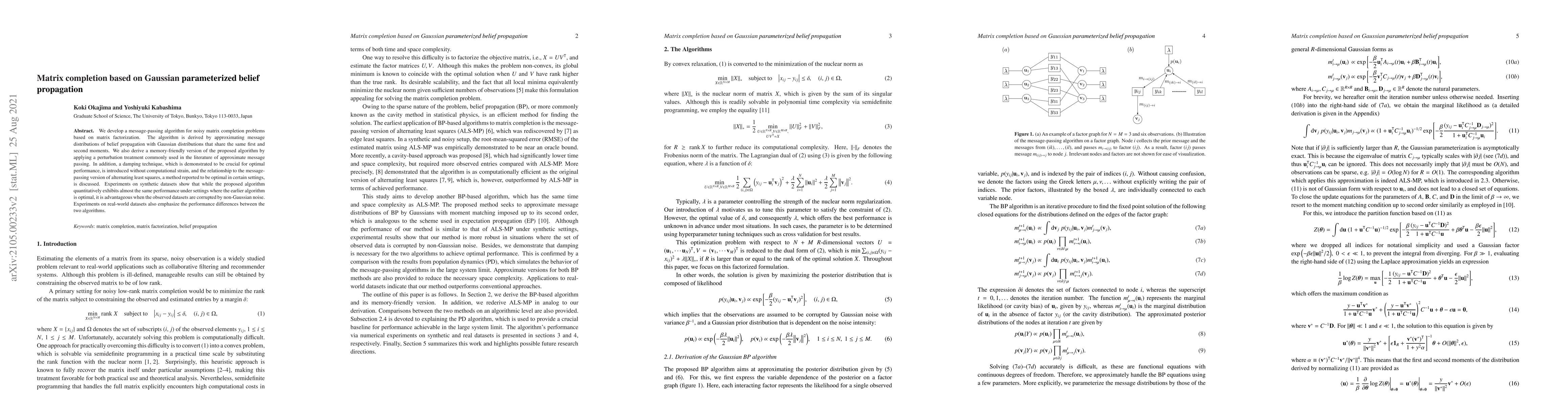 A new algorithm for matrix completion problems is proposed, which uses Gaussian parameterized belief propagation and outperforms existing methods with non-Gaussian noise.