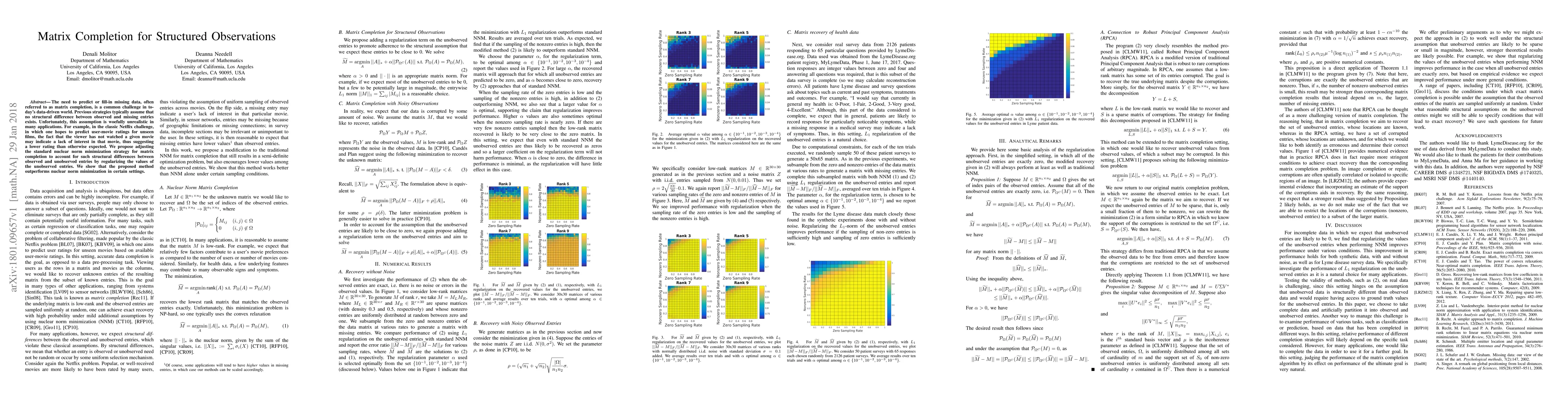 The paper addresses matrix completion challenges by proposing a method that accounts for structural differences between observed and missing data entries, particularly for applications like the Netflix challenge. The new regularization-based approach outperforms traditional nuclear norm minimization in specific scenarios.