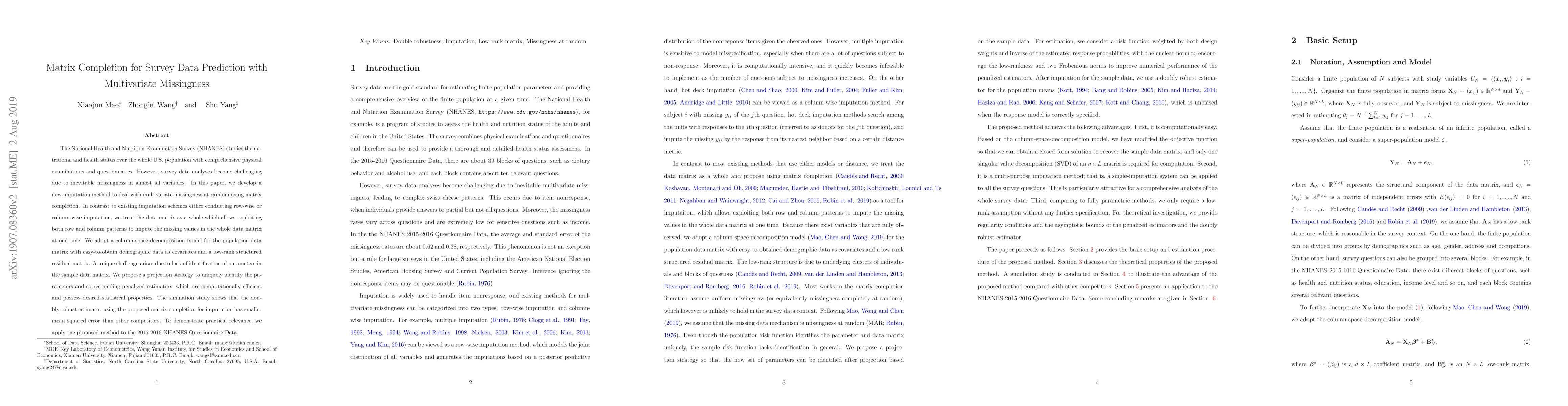 Researchers developed a new method to predict missing values in survey data using matrix completion, which exploits both row and column patterns for accurate imputation. The proposed method showed smaller mean squared error than other competitors in simulation studies and was applied to real-world NHANES data.