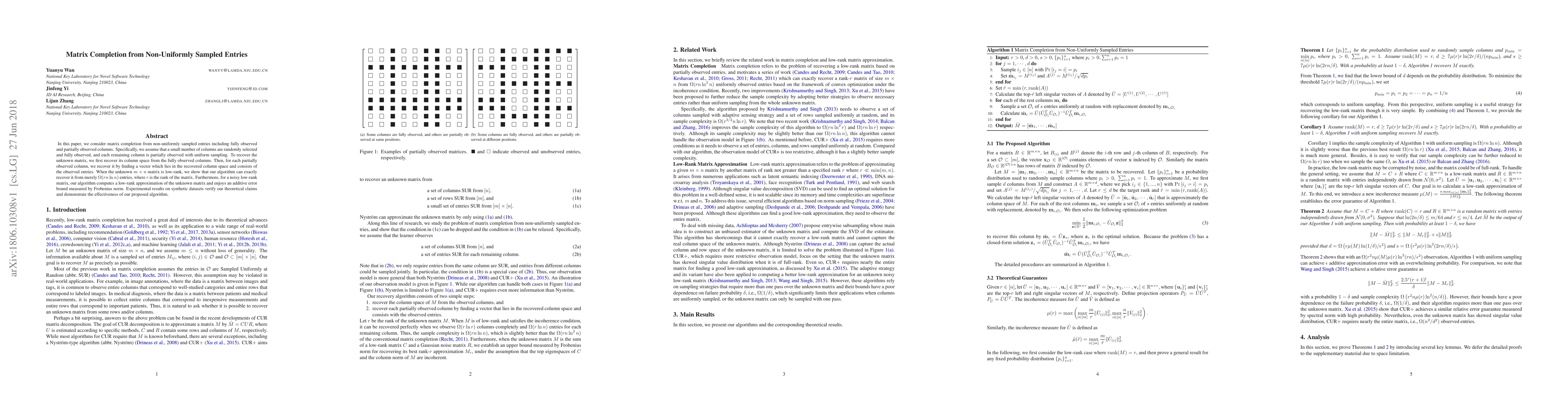 This paper proposes an algorithm for matrix completion from non-uniformly sampled entries, recovering low-rank matrices from $\Omega(rn\ln n)$ entries. It accurately reconstructs fully observed columns and partially observed columns with uniform sampling, and provides a low-rank approximation for noisy matrices with an additive error bound.