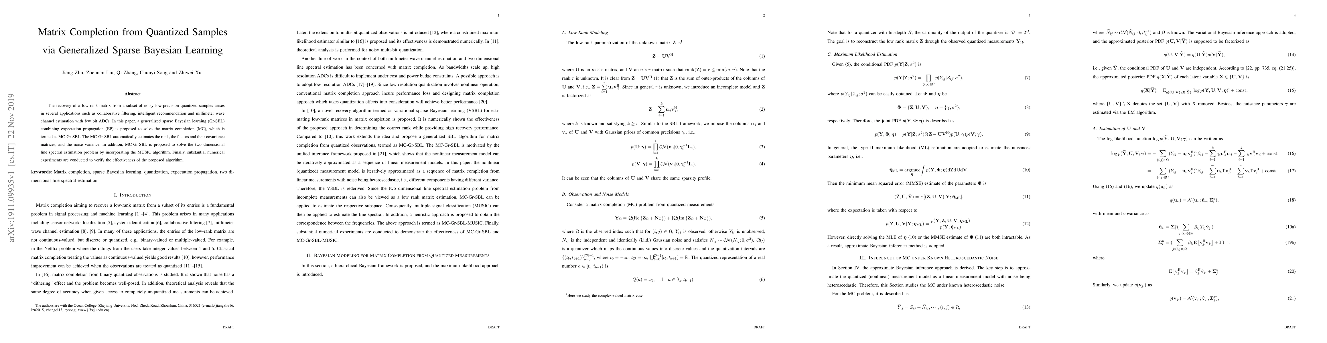 A new algorithm called MC-Gr-SBL is proposed to recover a low-rank matrix from noisy quantized samples in various applications like collaborative filtering and millimeter wave channel estimation.