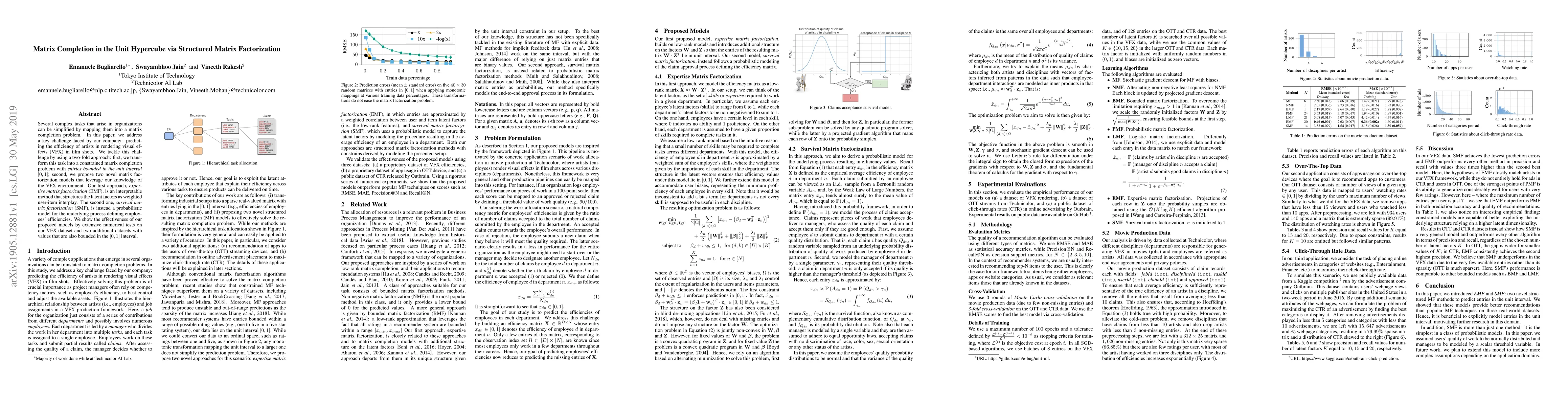 Several complex tasks that arise in organizations can be simplified by mapping them into a matrix completion problem. In this paper, we address a key challenge faced by our company: predicting the efficiency of artists in rendering visual effects (VFX) in film shots. We tackle this challenge by using a two-fold approach: first, we transform this task into a constrained matrix completion problem with entries bounded in the unit interval [0, 1]; second, we propose two novel matrix factorization models that leverage our knowledge of the VFX environment. Our first approach, expertise matrix factorization (EMF), is an interpretable method that structures the latent factors as weighted user-item interplay. The second one, survival matrix factorization (SMF), is instead a probabilistic model for the underlying process defining employees' efficiencies. We show the effectiveness of our proposed models by extensive numerical tests on our VFX dataset and two additional datasets with values that are also bounded in the [0, 1] interval.