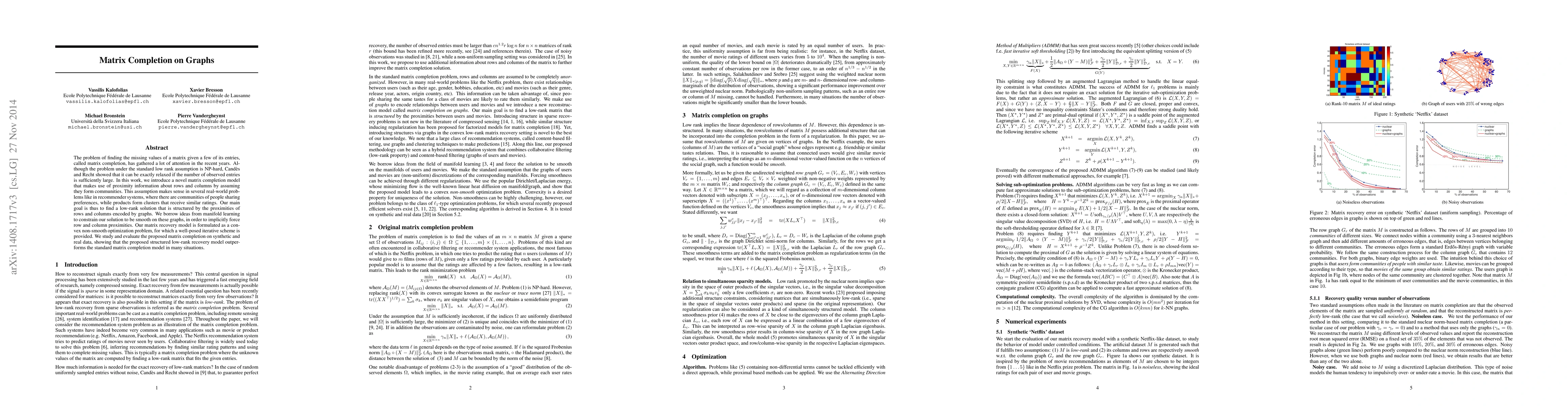 The problem of finding the missing values of a matrix given a few of its entries, called matrix completion, has gathered a lot of attention in the recent years. Although the problem under the standard low rank assumption is NP-hard, Cand\`es and Recht showed that it can be exactly relaxed if the number of observed entries is sufficiently large. In this work, we introduce a novel matrix completion model that makes use of proximity information about rows and columns by assuming they form communities. This assumption makes sense in several real-world problems like in recommender systems, where there are communities of people sharing preferences, while products form clusters that receive similar ratings. Our main goal is thus to find a low-rank solution that is structured by the proximities of rows and columns encoded by graphs. We borrow ideas from manifold learning to constrain our solution to be smooth on these graphs, in order to implicitly force row and column proximities. Our matrix recovery model is formulated as a convex non-smooth optimization problem, for which a well-posed iterative scheme is provided. We study and evaluate the proposed matrix completion on synthetic and real data, showing that the proposed structured low-rank recovery model outperforms the standard matrix completion model in many situations.