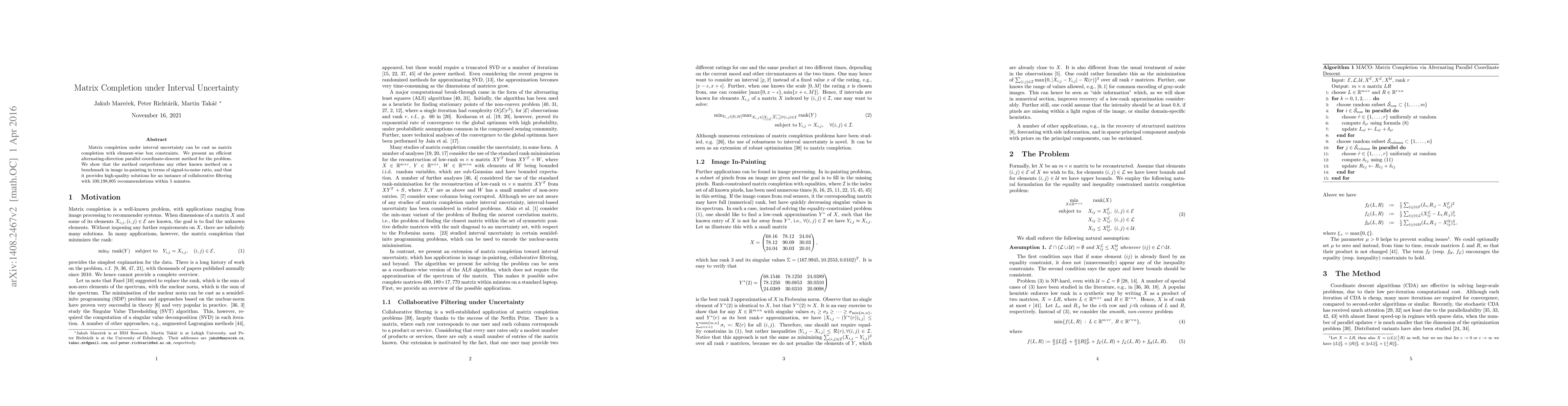 A new method for matrix completion under interval uncertainty outperforms existing methods in image in-painting and provides high-quality solutions for collaborative filtering within minutes.