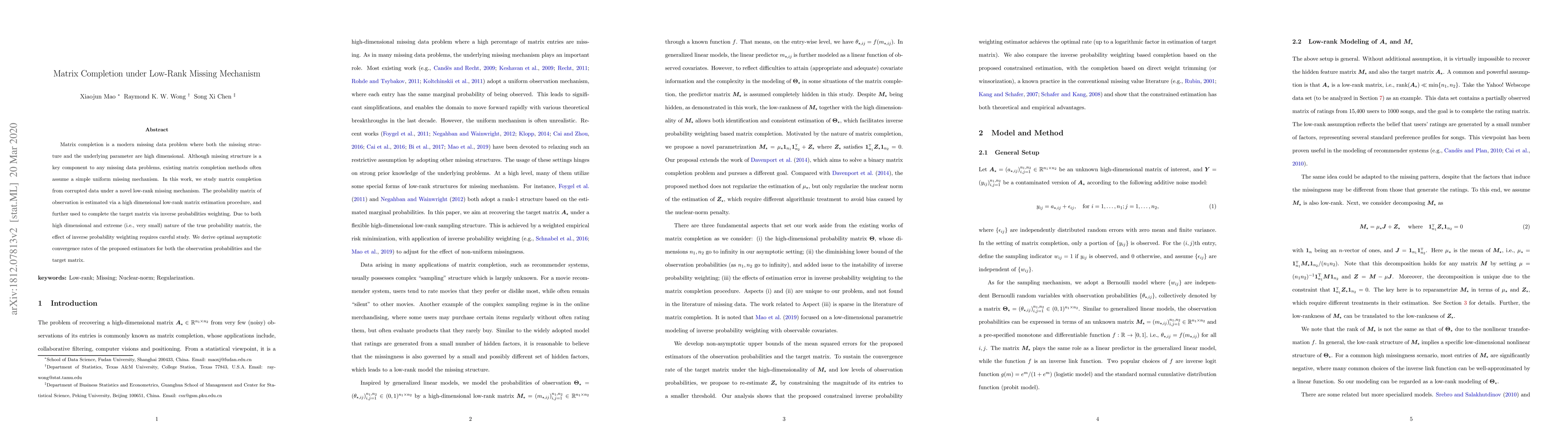 This paper proposes a novel method for matrix completion under a low-rank missing mechanism, estimating the observation probability matrix via low-rank matrix estimation and completing the target matrix using inverse probability weighting. The authors derive optimal asymptotic convergence rates for both the estimated probability matrix and the completed target matrix.