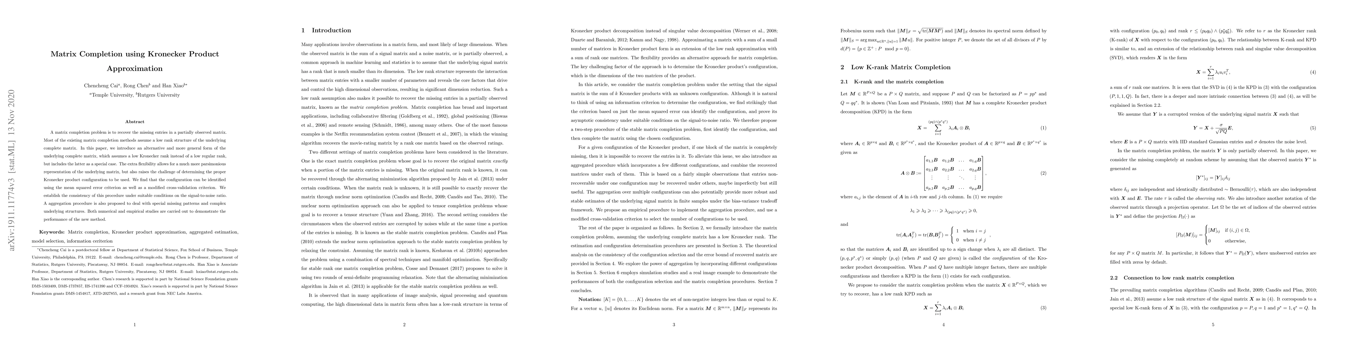 This paper proposes a novel matrix completion method using Kronecker product approximation to recover missing entries in partially observed matrices, assuming a low Kronecker rank instead of a low regular rank. The authors identify the optimal Kronecker product configuration using mean squared error and cross-validation criteria, and demonstrate the method's performance through numerical and empirical studies.