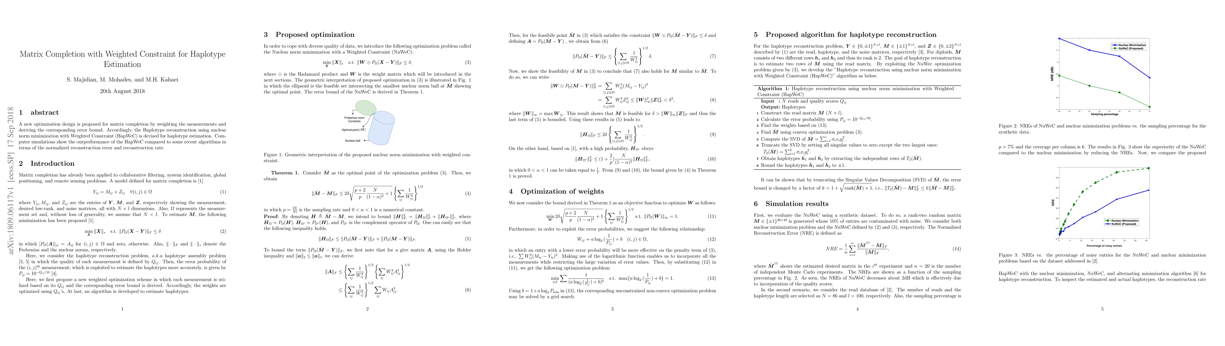 A new optimization design for matrix completion is proposed to improve haplotype estimation accuracy through weighted constraints, showing outperformance in computer simulations.