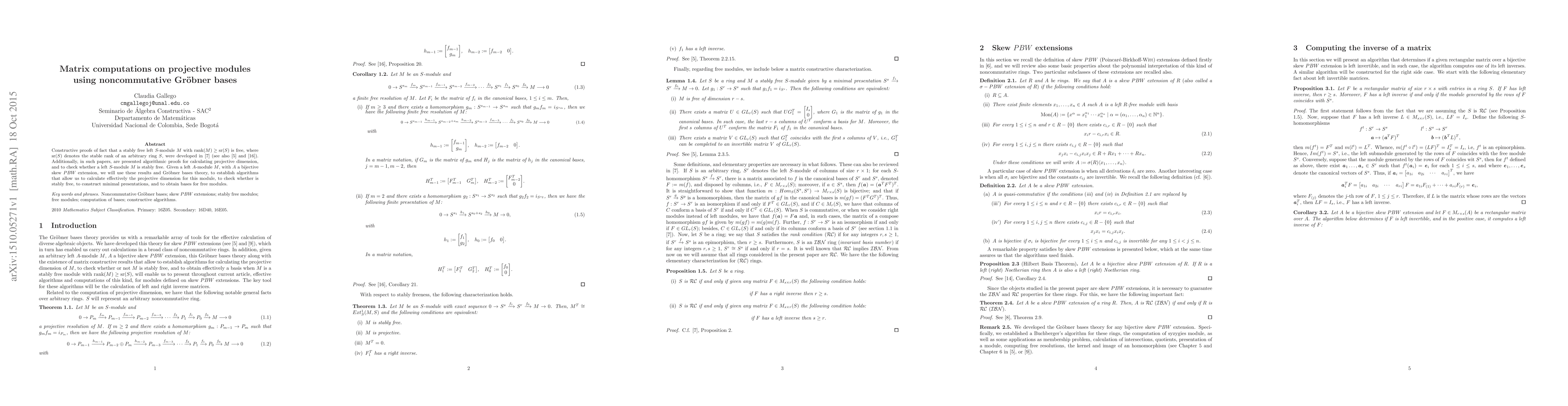 Constructive proofs of fact that a stably free left $S$-module $M$ with rank$(M)\geq$sr$(S)$ is free, where sr$(S)$ denotes the stable rank of an arbitrary ring $S$, were developed in some articles. Additionally, in such papers, are presented algorithmic proofs for calculating projective dimension, and to check whether a left $S$-module $M$ is stably free. Given a left $A$-module $M$, with $A$ a bijective skew $PBW$ extension, we will use these results and Gr\"obner bases theory, to establish algorithms that allow us to calculate effectively the projective dimension for this module, to check whether is stably free, to construct minimal presentations, and to obtain bases for free modules.