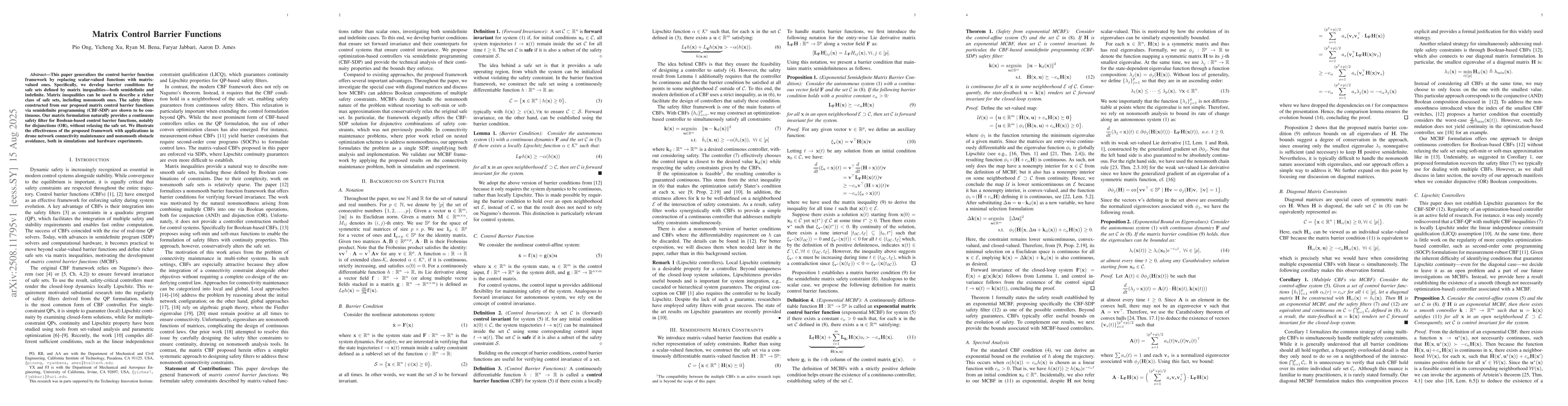 This paper generalizes the control barrier function framework by replacing scalar-valued functions with matrix-valued ones. Specifically, we develop barrier conditions for safe sets defined by matrix inequalities -- both semidefinite and indefinite. Matrix inequalities can be used to describe a richer class of safe sets, including nonsmooth ones. The safety filters constructed from our proposed matrix control barrier functions via semidefinite programming (CBF-SDP) are shown to be continuous. Our matrix formulation naturally provides a continuous safety filter for Boolean-based control barrier functions, notably for disjunctions (OR), without relaxing the safe set. We illustrate the effectiveness of the proposed framework with applications in drone network connectivity maintenance and nonsmooth obstacle avoidance, both in simulations and hardware experiments.