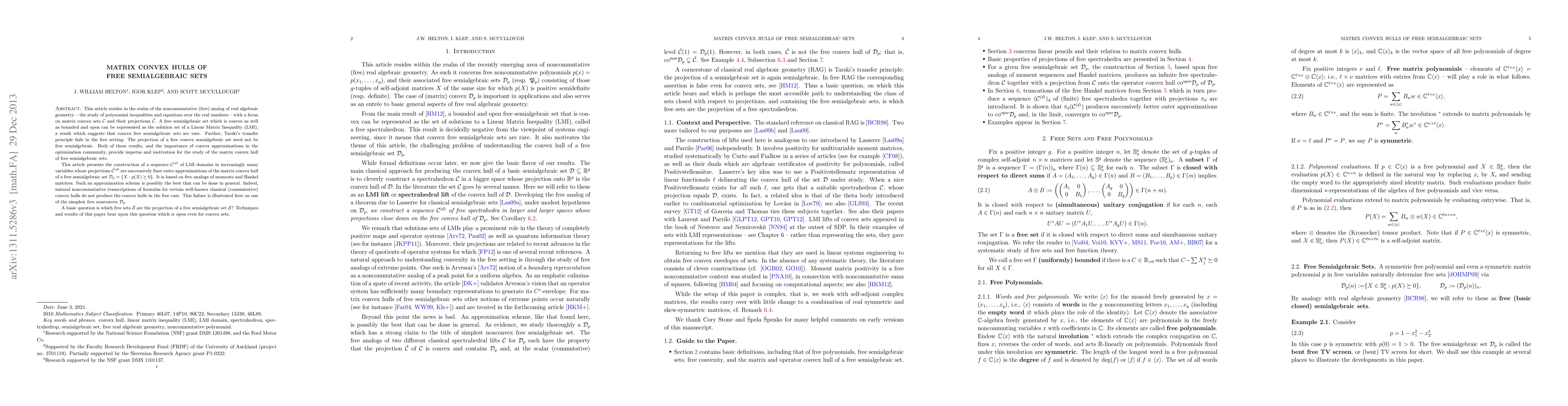 This paper explores the matrix convex hulls of free semialgebraic sets within noncommutative geometry, demonstrating that convex free semialgebraic sets are rare and that Tarski's transfer principle does not hold in this setting. It constructs an approximation sequence based on free moments and Hankel matrices to address the question of which free sets are projections of free semialgebraic sets.
