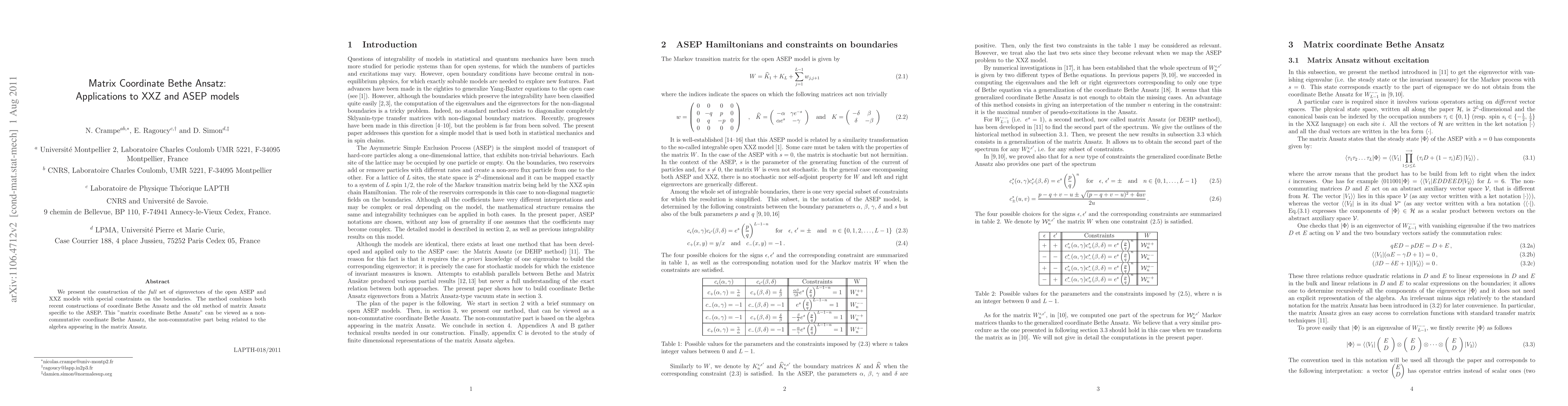 Summary: This paper introduces a "matrix coordinate Bethe Ansatz" method to construct eigenvectors for the open ASEP and XXZ models, combining coordinate Bethe Ansatz with matrix Ansatz techniques, and highlighting its non-commutative aspects.