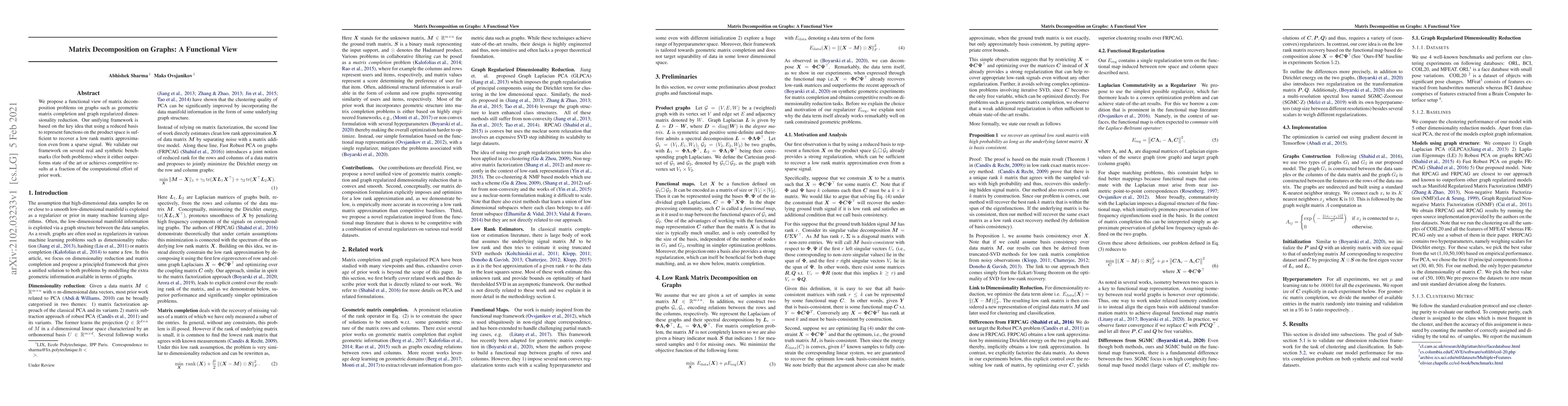 The paper proposes a functional view of matrix decomposition problems on graphs, utilizing a reduced basis to represent functions on the product space for low-rank matrix approximation, even from sparse signals. This framework is validated on various benchmarks for geometric matrix completion and graph regularized dimensionality reduction, demonstrating either superior performance or competitive results at a fraction of the computational cost of prior methods.