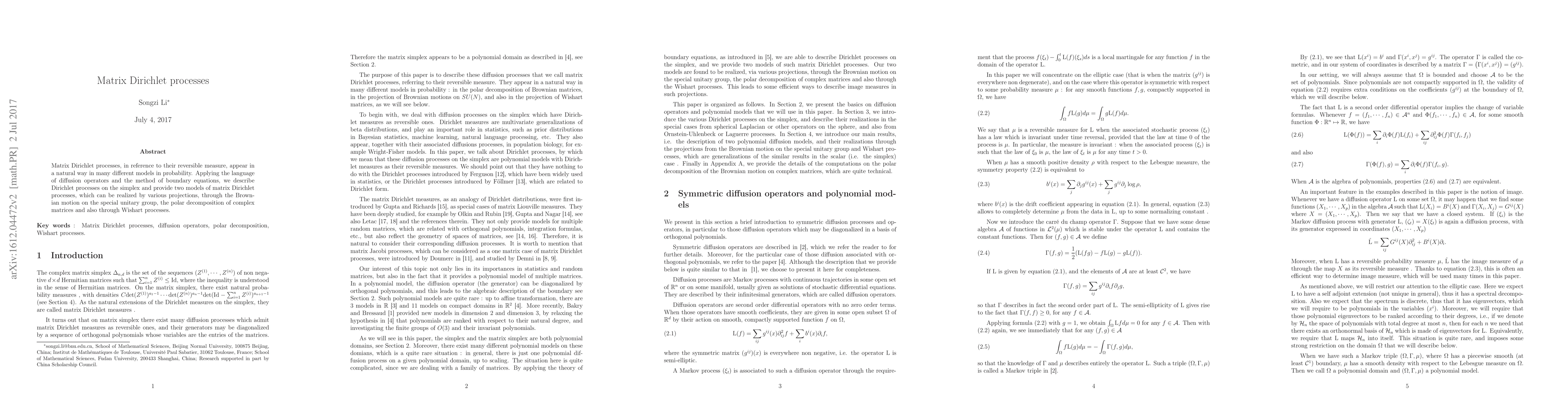 Summary: Matrix Dirichlet processes are explored through reversible measures and their applications in probability models. The paper introduces two models realized via Brownian motion on the special unitary group, polar decomposition, and Wishart processes, utilizing diffusion operators and boundary equations.