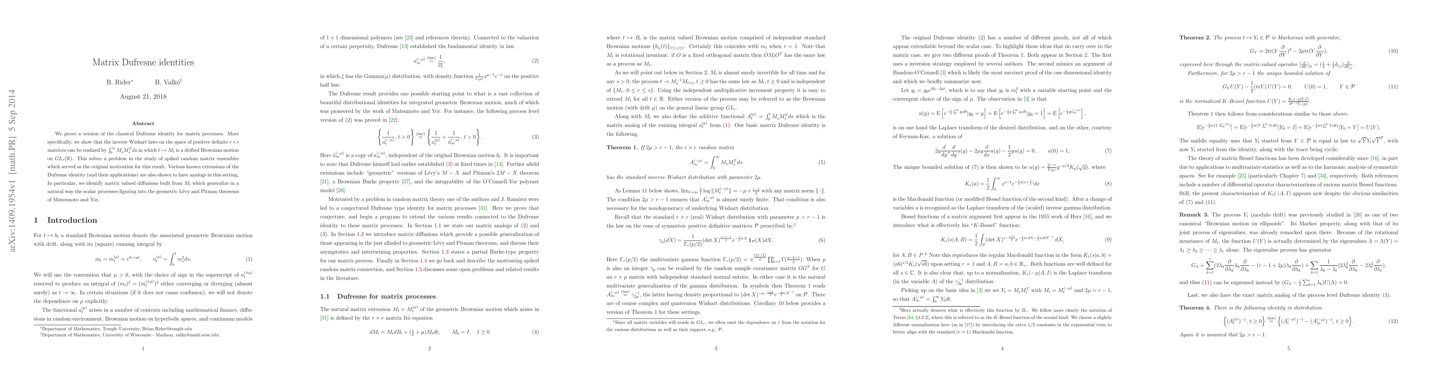 We prove a version of the classical Dufresne identity for matrix processes. In particular, we show that the inverse Wishart laws on the space of positive definite r x r matrices can be realized by the infinite time horizon integral of M_t times its transpose in which t -> M_t is a drifted Brownian motion on the general linear group. This solves a problem in the study of spiked random matrix ensembles which served as the original motivation for this result. Various known extensions of the Dufresne identity (and their applications) are also shown to have analogs in this setting. For example, we identify matrix valued diffusions built from M_t which generalize in a natural way the scalar processes figuring into the geometric Levy and Pitman theorems of Matsumoto and Yor.