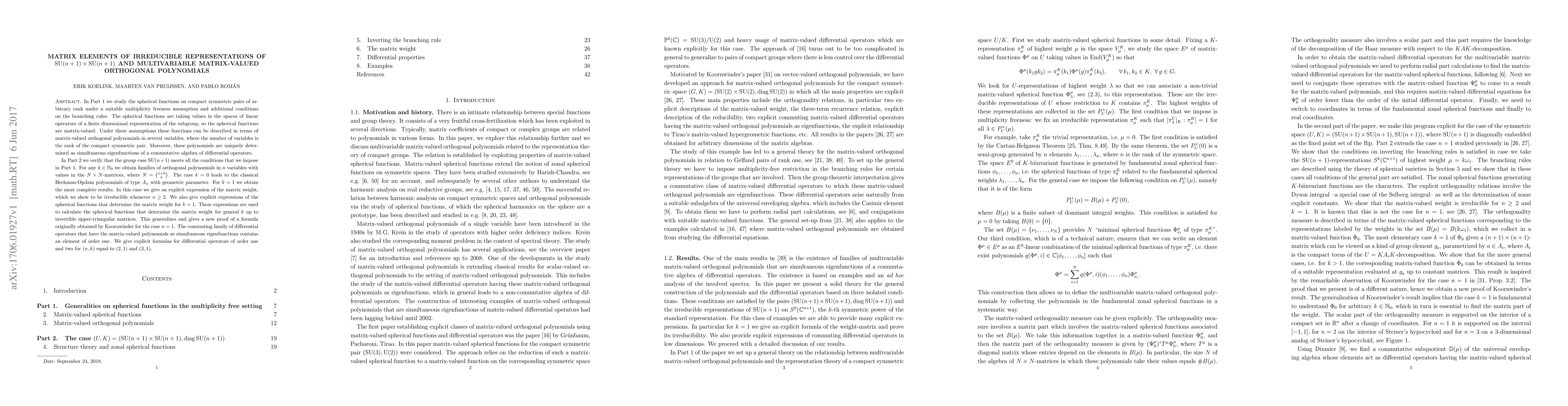 In Part 1 we study the spherical functions on compact symmetric pairs of arbitrary rank under a suitable multiplicity freeness assumption and additional conditions on the branching rules. The spherical functions are taking values in the spaces of linear operators of a finite dimensional representation of the subgroup, so the spherical functions are matrix-valued. Under these assumptions these functions can be described in terms of matrix-valued orthogonal polynomials in several variables, where the number of variables is the rank of the compact symmetric pair. Moreover, these polynomials are uniquely determined as simultaneous eigenfunctions of a commutative algebra of differential operators. In Part 2 we verify that the group case $\mathrm{SU}(n+1)$ meets all the conditions that we impose in Part 1. For any $k\in\mathbb{N}_{0}$ we obtain families of orthogonal polynomials in $n$ variables with values in the $N\times N$-matrices, where $N=\binom{n+k}{k}$. The case $k=0$ leads to the classical Heckman-Opdam polynomials of type $A_{n}$ with geometric parameter. For $k=1$ we obtain the most complete results. In this case we give an explicit expression of the matrix weight, which we show to be irreducible whenever $n\ge2$. We also give explicit expressions of the spherical functions that determine the matrix weight for $k=1$. These expressions are used to calculate the spherical functions that determine the matrix weight for general $k$ up to invertible upper-triangular matrices. This generalizes and gives a new proof of a formula originally obtained by Koornwinder for the case $n=1$. The commuting family of differential operators that have the matrix-valued polynomials as simultaneous eigenfunctions contains an element of order one. We give explicit formulas for differential operators of order one and two for $(n,k)$ equal to $(2,1)$ and $(3,1)$.